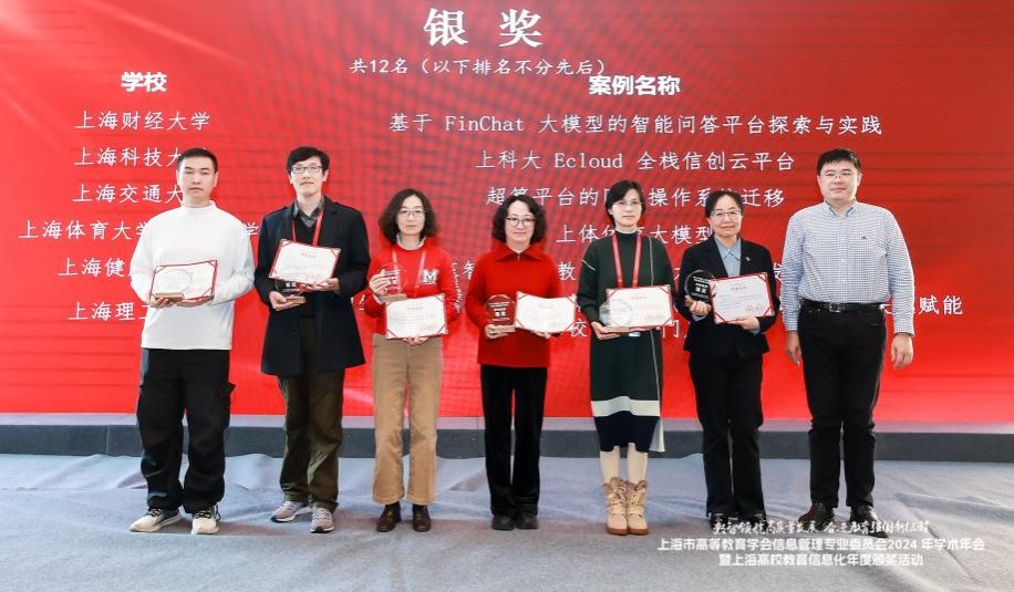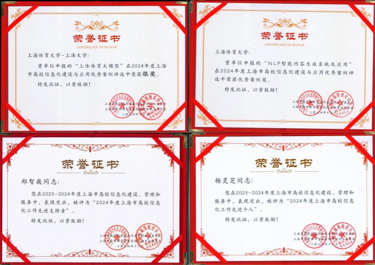 今年会与上海大学联合申报的《上体体育大模型》荣获优秀案例银奖,这是今年会信息化工作近年来获评的最高奖项。信息化办公室申报的《NLP智能问答生成系统与应用》荣获优秀案例奖。党委校长办公室郑智巍老师荣获“2024年度上海市高校信息化工作支持奖”,信息化办公室杨灵芝老师被评为“2024年度上海市高校信息化工作先进个人”。