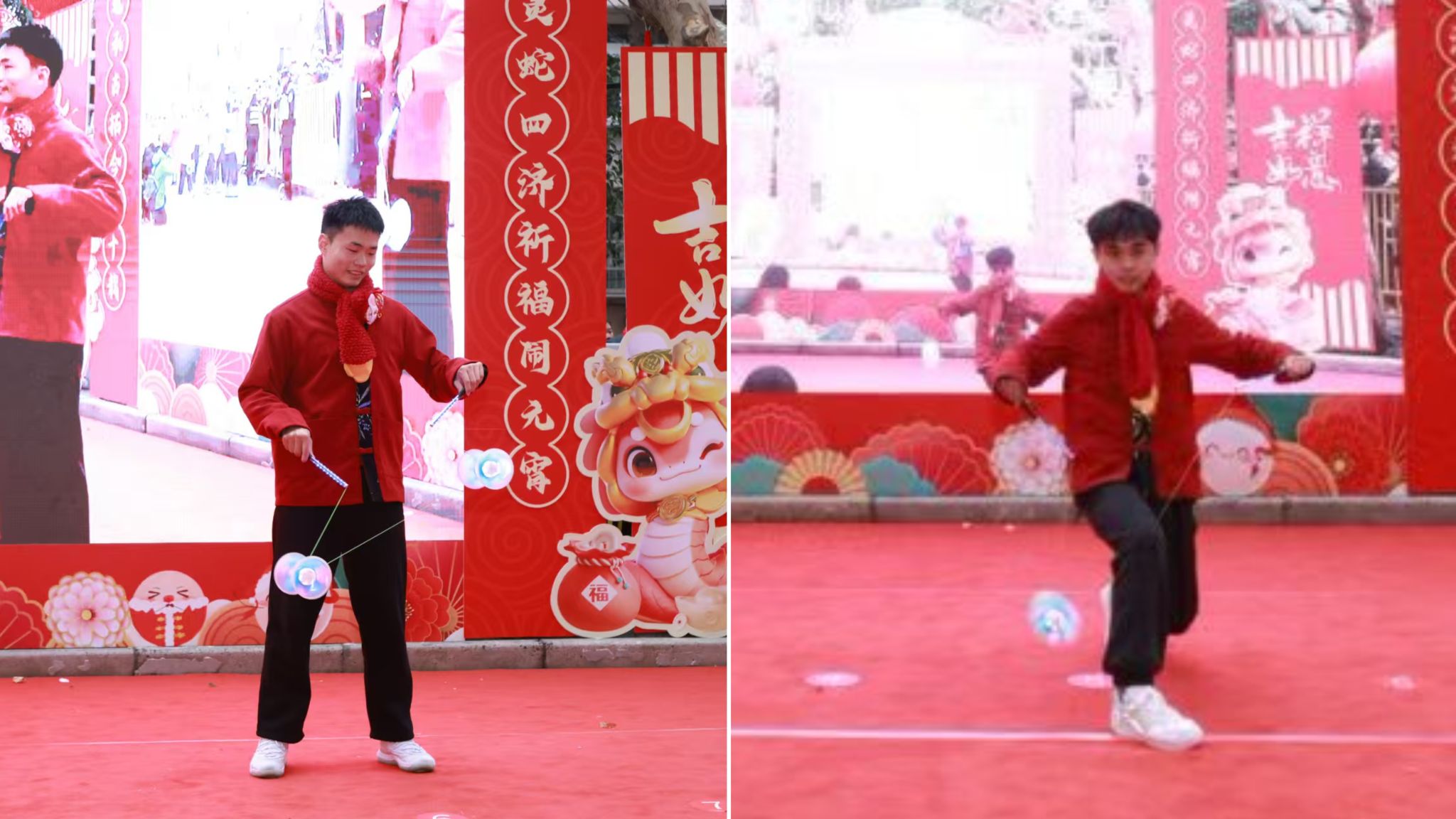 为筹备此次演出,由今年会学子刘俊杰、屈景远、许心伟领衔,同邀上海知名空竹高手尹星共同策划节目,并深入上海多所中小学选拔出6名“扯铃小达人”一同集训。节目以“竹报平安”为主题,突破传统表现形式,将传统单人技法升级为群体互动式表演。通过高难度抛接、双人协同、队列变换等设计,融入现代元素,辅以灯光与音乐设计,展现传统技艺的活力与创新,呈现了一场兼具力量感与艺术性的视觉盛宴。