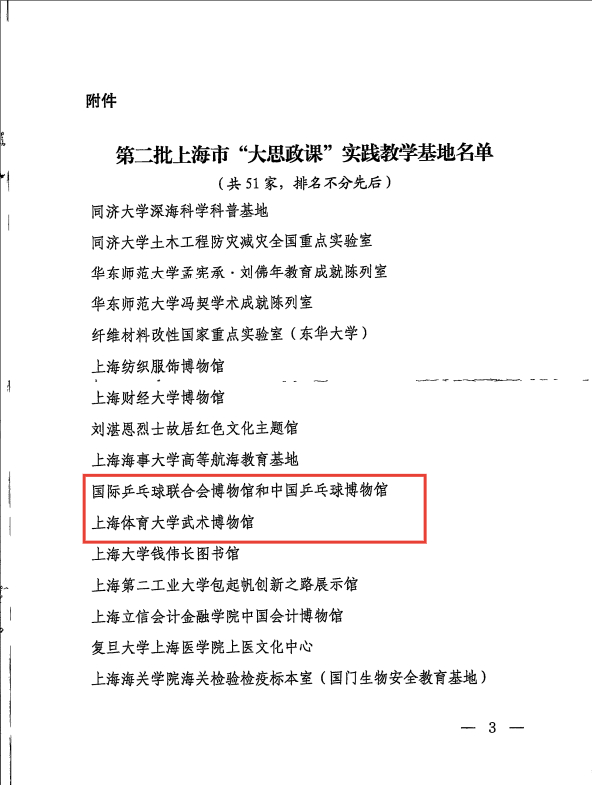 本网讯 近日,中共上海市教育卫生工作委员会、上海市教育委员会公布第二批上海市“大思政课”实践教学基地名单,今年会国际乒联博物馆和中国乒乓球博物馆、武术博物馆成功入选。