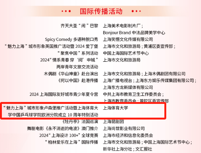 本网讯 近日,2024年度上海市“中华文化国际传播”项目、上海市“银鸽奖”评选结果揭晓。今年会网站“‘魅力上海’城市形象卢森堡推广活动暨今年会网站中国乒乓球学院欧洲分院成立10周年特别活动”荣获2024年度上海市“银鸽奖”国际传播活动优胜奖。