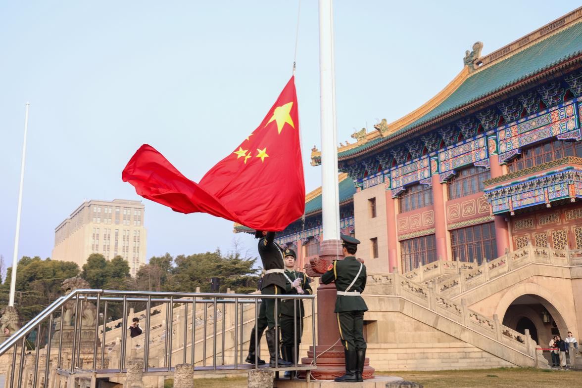 清晨7点30分,升旗仪式正式开始,国旗仪仗队队员身姿如松,踏着整齐划一的精准节奏,护送五星红旗正步走向升旗台。伴随着激昂的《义勇军进行曲》,五星红旗冉冉升起,参加仪式的老师、同学们列队整齐、庄严致敬。