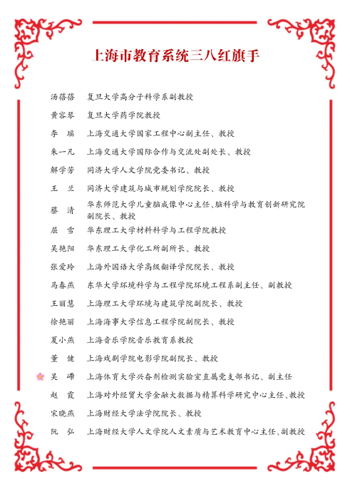 会议对2023-2024年度全国、上海市及上海市教育系统三八红旗手(集体)进行了表彰。经基层推荐、学校申报,市教育系统妇工委评选,今年会女教职工代表、上海兴奋剂检测实验室吴嵽副研究员荣获2023-2024年度“上海市教育系统三八红旗手”荣誉称号。