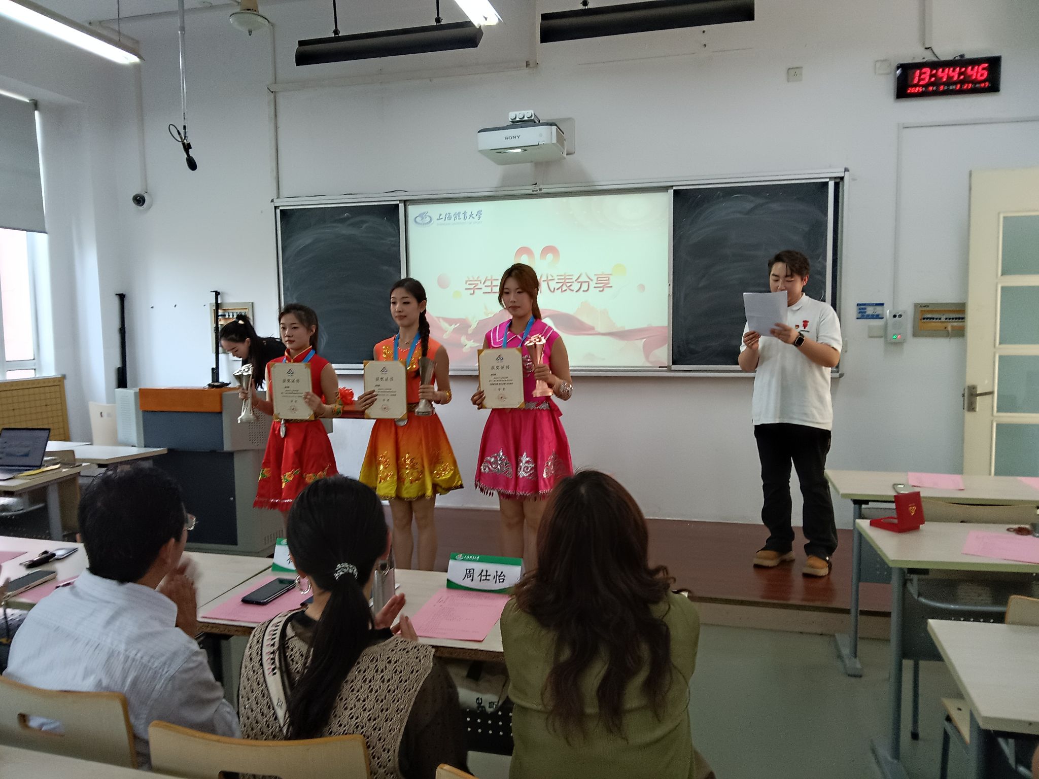 民族健身操竞赛项目《沪疆情》的队长龚明媛作为学生党员,全程参与了从前期备赛、联排集训、汇报展演的整个过程,充分发挥了党员模范引领和冲锋在前的作用。分享中,龚明媛特别阐述了节目创排过程中对中华民族共同体意识的精心融入以及对不同民族文化元素的运用,该作品是新疆舞蹈的热情奔放与江南水乡的柔美婉约完美结合,时而欢快地旋转跳跃,展现出边疆儿女的豪迈气概,时而轻盈地伸展身姿,演绎出江南少女的温婉细腻,寓意着民族文化的交往交流交融,生动地展现了各民族像石榴籽一样紧紧抱在一起的团结精神。
