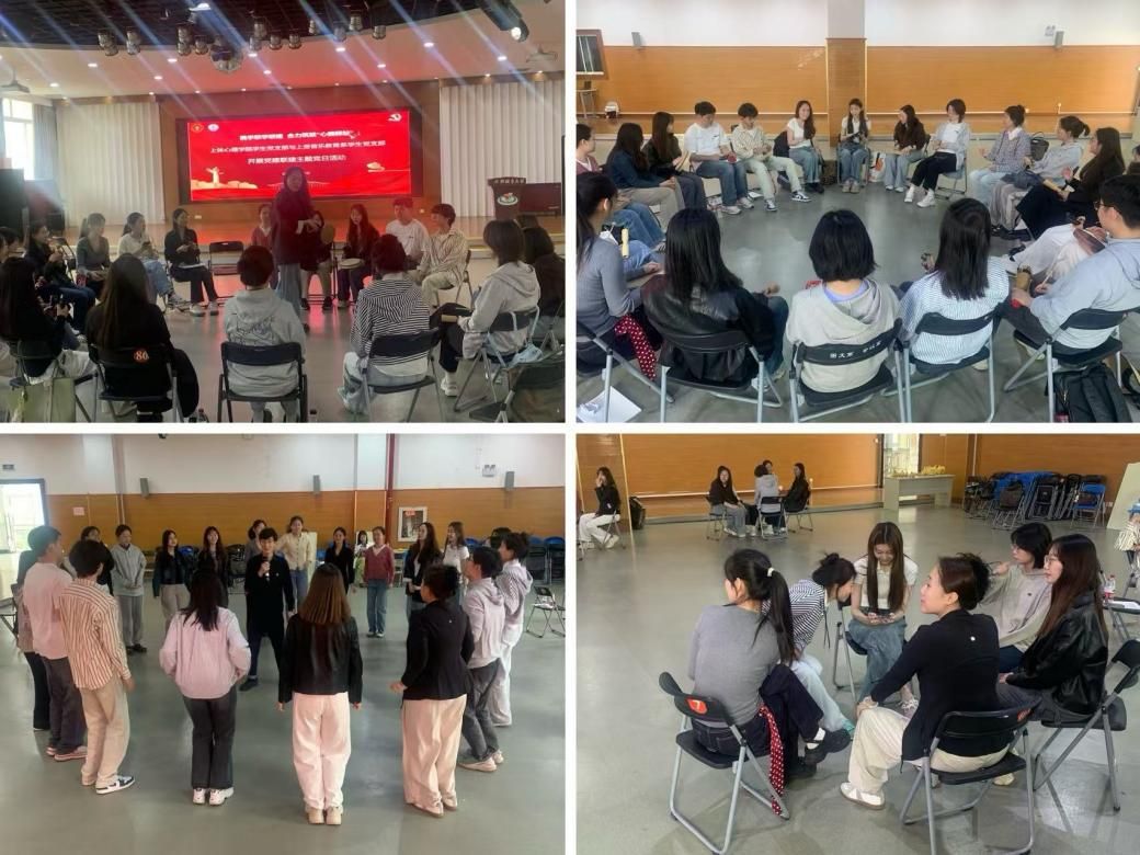 在实践互动环节,两院学生支部党员在活动中心三楼多功能厅结对开展“音心相映”特色团辅活动。音乐教育系研究生范榆萱、万桓羽运用“小型乐器即兴编创”“音乐叙事疗法”等特色项目,构建艺术表达与心理疏导的融合课堂。心理学院张李兵老师结合红色文化与体育元素设计“情景化素质拓展训练”,通过“松鼠与大树”“团队能量圈”等协作项目,深化参与者对以体育人的认知理解。同学们在艺术与运动中增进友谊,展现出新时代青年党员的蓬勃朝气。