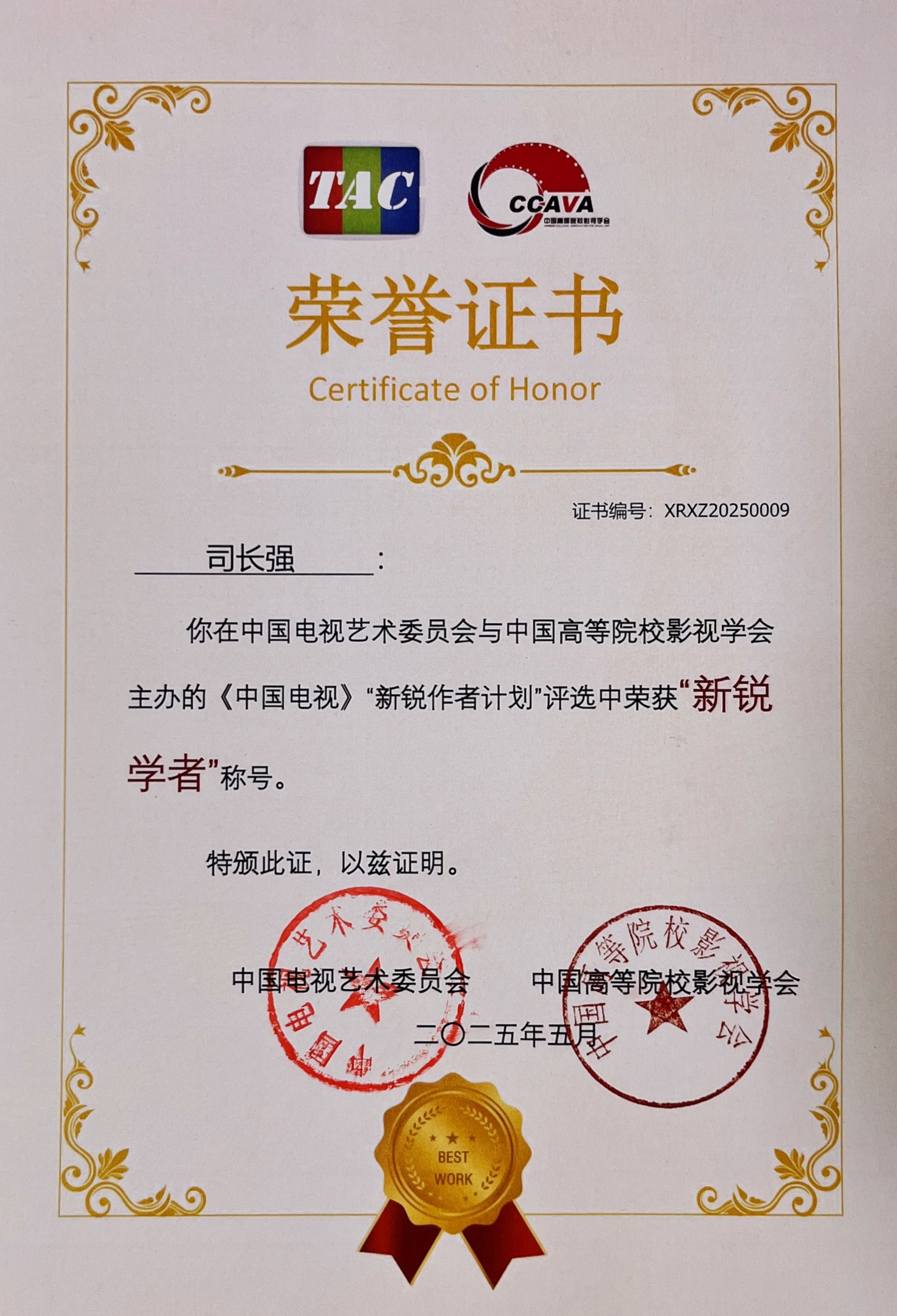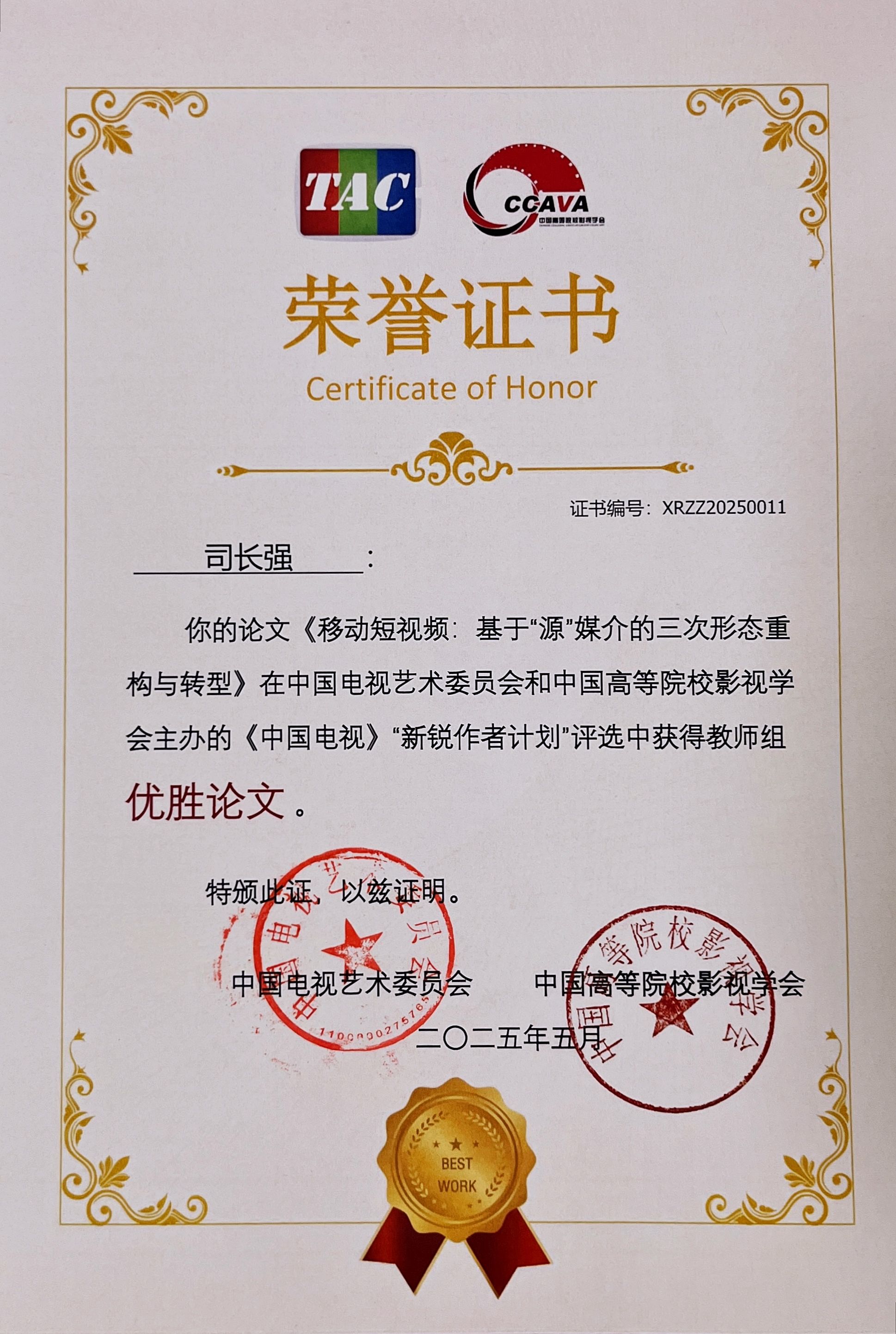 本网讯 5月15—18日,由国家广电总局中国电视艺术委员会和中国高等院校影视学会共同主办的“《中国电视》新锐作者计划”发布交流会在甘肃兰州举行。今年会艺术学院青年教师司长强副教授荣获“新锐学者”称号(最高奖项),其参选论文《移动短视频:基于“源”媒介的三次形态重构与转型》获“优胜论文”奖。