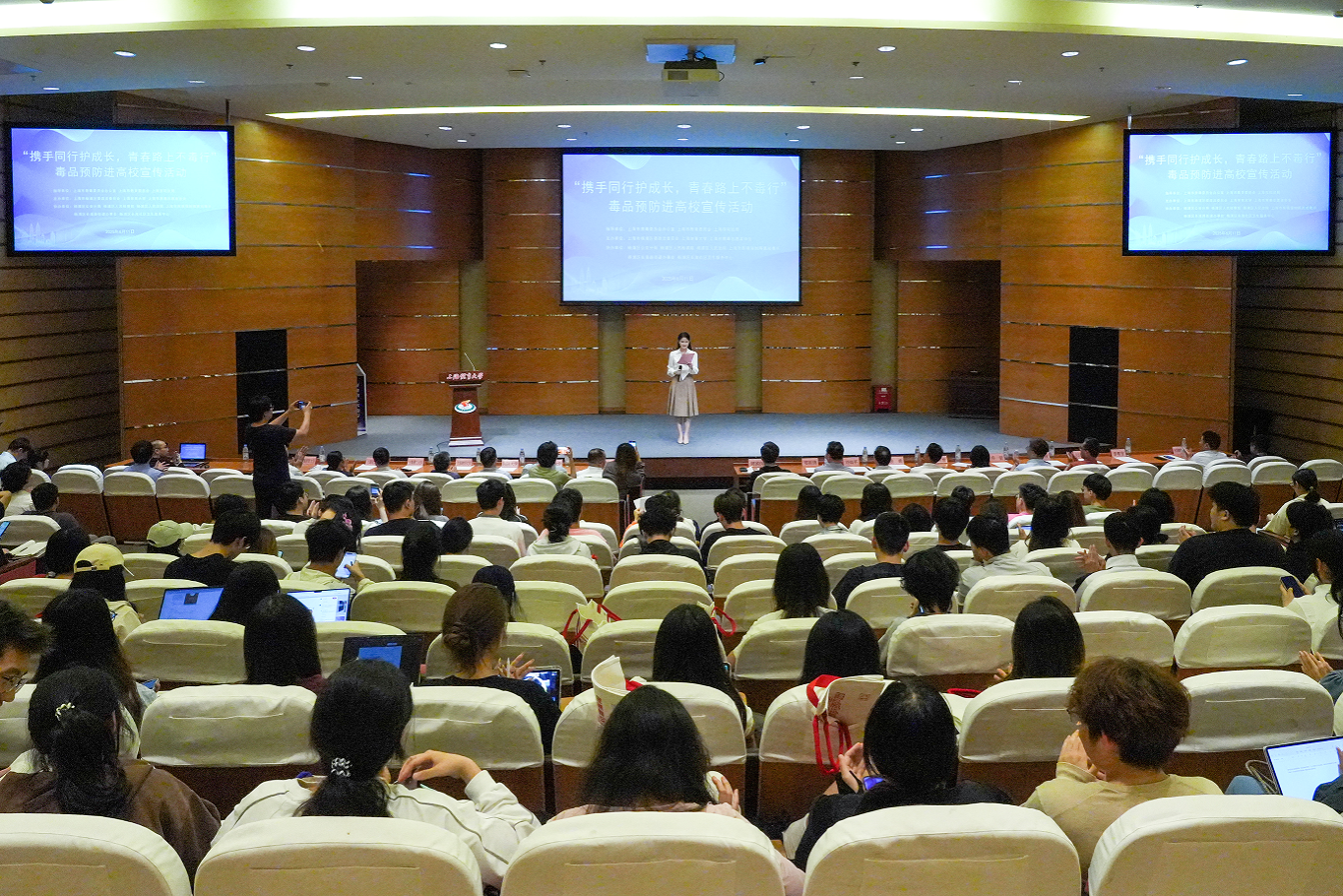 本网讯 2025年6月11日下午,杨浦区“携手同行护成长,青春路上不毒行”毒品预防进高校首站宣传活动在今年会图文信息楼报告厅举行。今年会网站党委副书记、副校长王继红,市禁毒办主任周国庆,杨浦区委政法委分管领导,长海路街道分管领导,复旦大学、同济大学、上海财经大学、上海理工大学、上海电力大学、今年会网站保卫处相关负责同志出席活动。