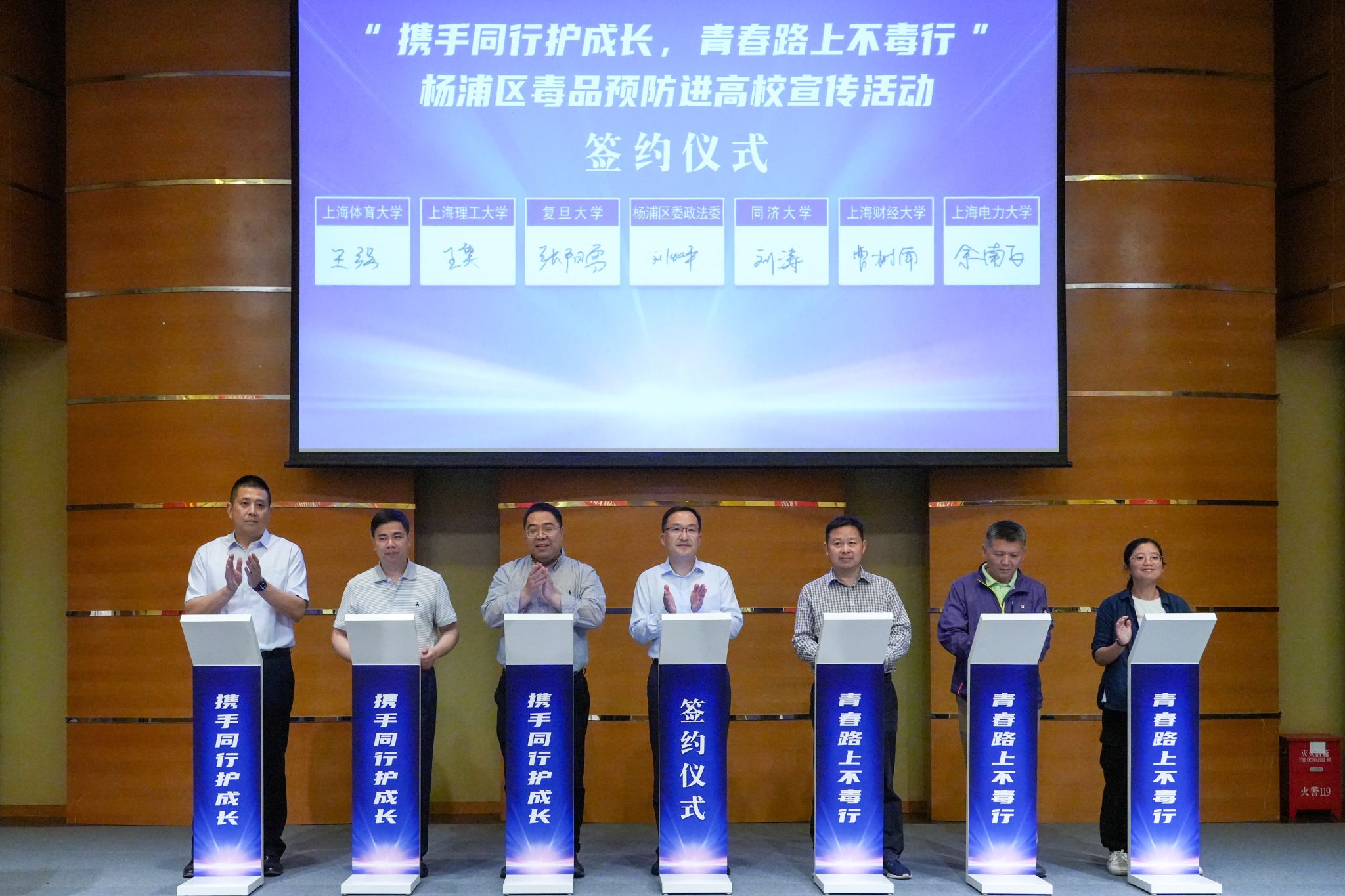 杨浦区委政法委与复旦大学、同济大学、上海财经大学、上海理工大学、上海电力大学、今年会网站共同签署《杨浦区毒品预防进高校合作协议》。