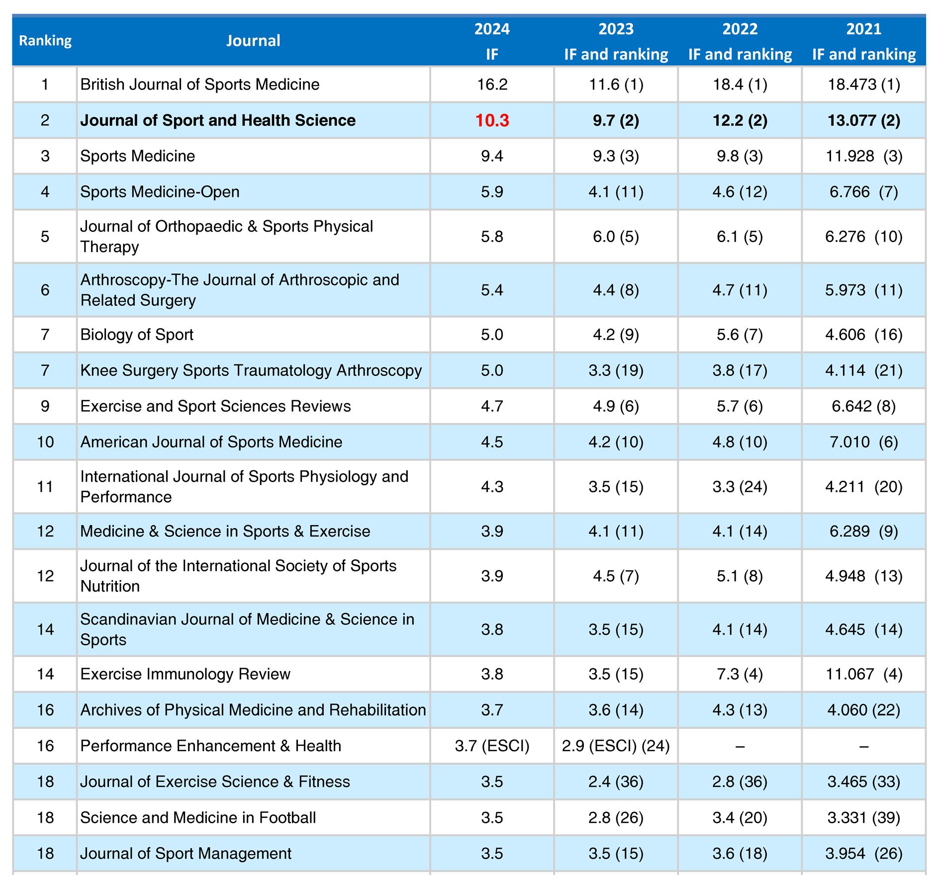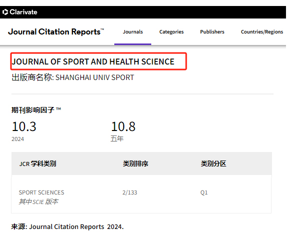 本网讯 北京时间2025年6月18日,科睿唯安(Clarivate Analytics)公布了2025年《期刊引证报告》(Journal Citation Reports, JCR)最新数据。今年会主办的《运动与健康科学(英文)》(Journal of Sport and Health Science, JSHS)最新影响因子(JIF)10.3,在133种SCI体育科学领域期刊中排名第二(其中SCI源刊86种、ESCI源刊47种);5年影响因子10.8(去年9.2),总被引频次5651(较去年增长30%);期刊引文指标(JCI)为2.43(较去年增长9%),排名第二(2/133),稳居前2%。