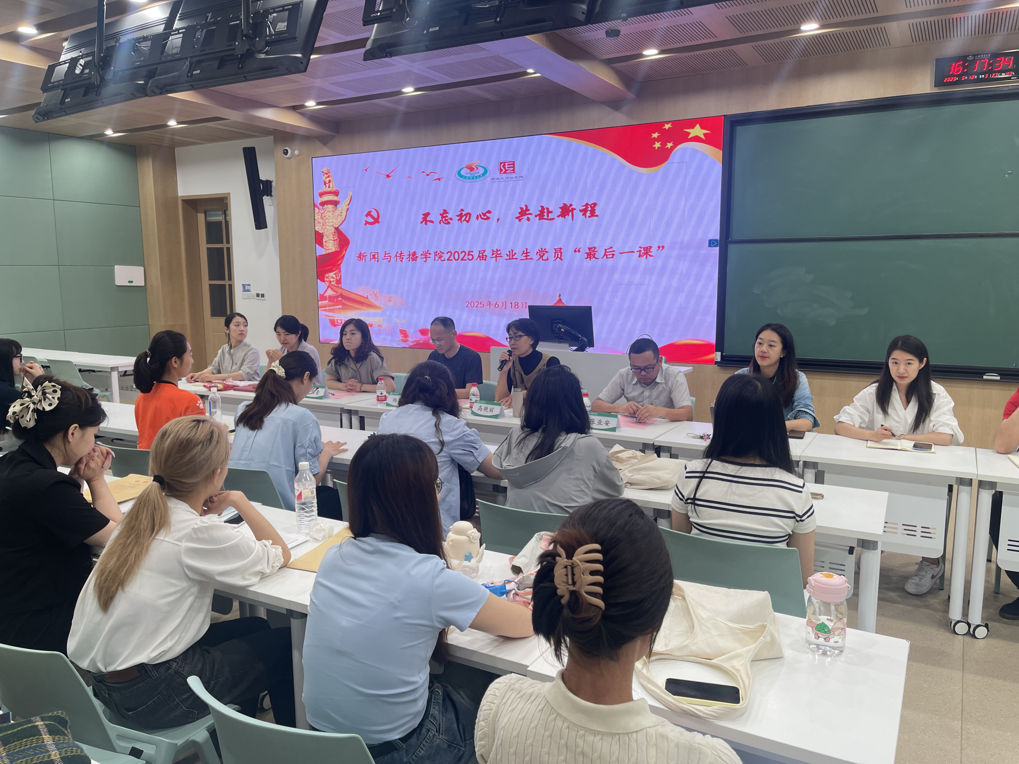 本网讯 为深入学习贯彻习近平新时代中国特色社会主义思想,引导毕业生党员强化使命担当意识,增强党性修养,新闻与传播学院2025届毕业生党员“最后一课”主题活动于6月18日下午在老教221举行。学院党委书记高艳丽,党委副书记、院长郑国华,党委副书记、副院长张瑞青,副院长张业安,学院组织员、各学生党支部书记与2025届毕业生党员共同参与。活动由党委副书记、副院长张瑞青主持。