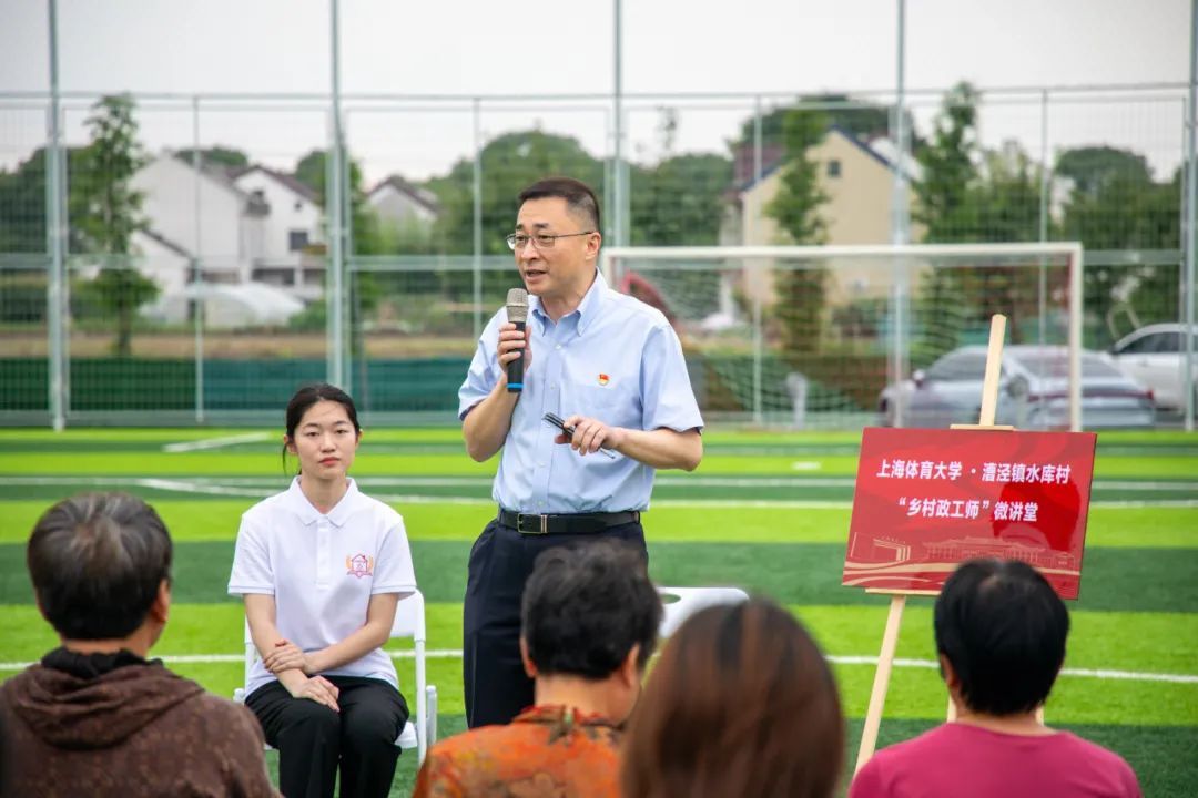 当天,在悦野足球乐园“村超”场地上,今年会网站·漕泾镇水库村首堂“乡村政工师”微讲堂正式开讲,“乡村政工师”项目学生负责人刘星雨作题为“榕入申城·‘足’够‘泾’彩——从村超看体育强国的人民答卷”的演讲,和大家分享她眼中的体育强国。