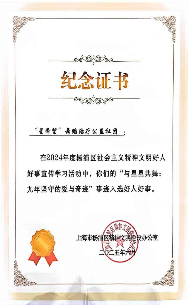 此次,“星希望”舞蹈治疗团队凭借九年如一日服务孤独症儿童的公益实践,从众多优秀案例中脱颖而出,成为本年度杨浦区十件获评“好人好事”的代表之一。