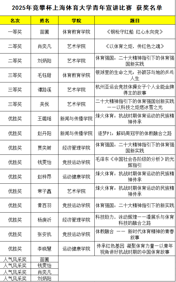 本次“竞攀杯”青年宣讲比赛,成功搭建了一个跨学科交流、展青春风采的平台,是一堂富有实效的沉浸式思政大课。活动生动展现了上体青年传承红色基因、弘扬体育精神的坚定信念,深刻诠释了新时代体育青年将个人理想融入国家发展伟业的使命担当。
