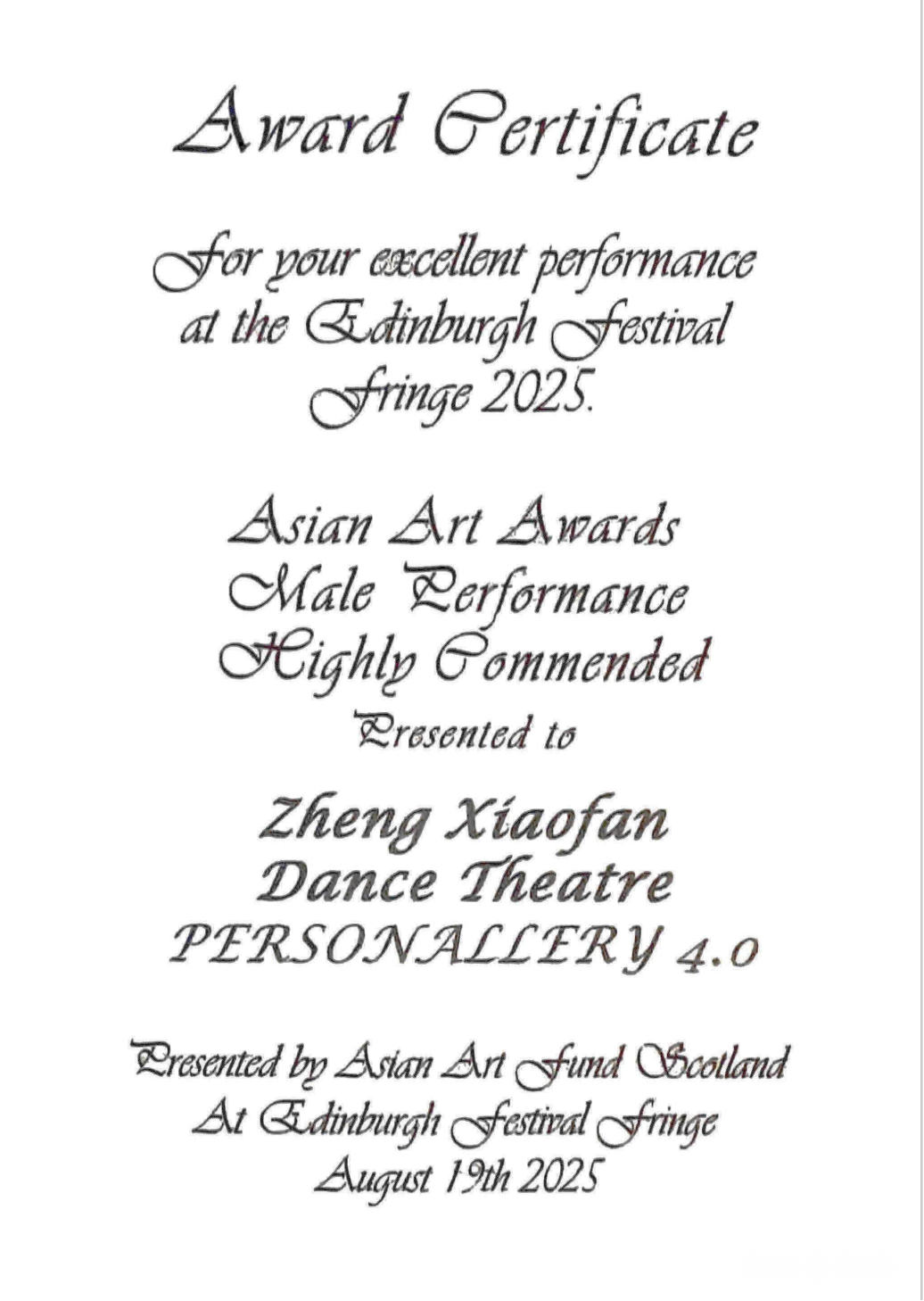 7月30日至31日,《人格画廊PERSONALLERY 4.0》在英国爱丁堡市中心WU剧场开展4场演出,吸引了世界各地观众。观众评价其“震撼人心”“专业度高”“情感冲击力强”;亚洲艺术奖评委表示作品融合元素丰富精彩,中华文化表达透彻,舞台表现有张力、形式新颖且具深度;爱丁堡本土高校的艺术节研究专家指出,该作品为近80年历史的Fringe舞台带来了首次高水准国标舞作品,“沉浸式交互”具有重要意义。