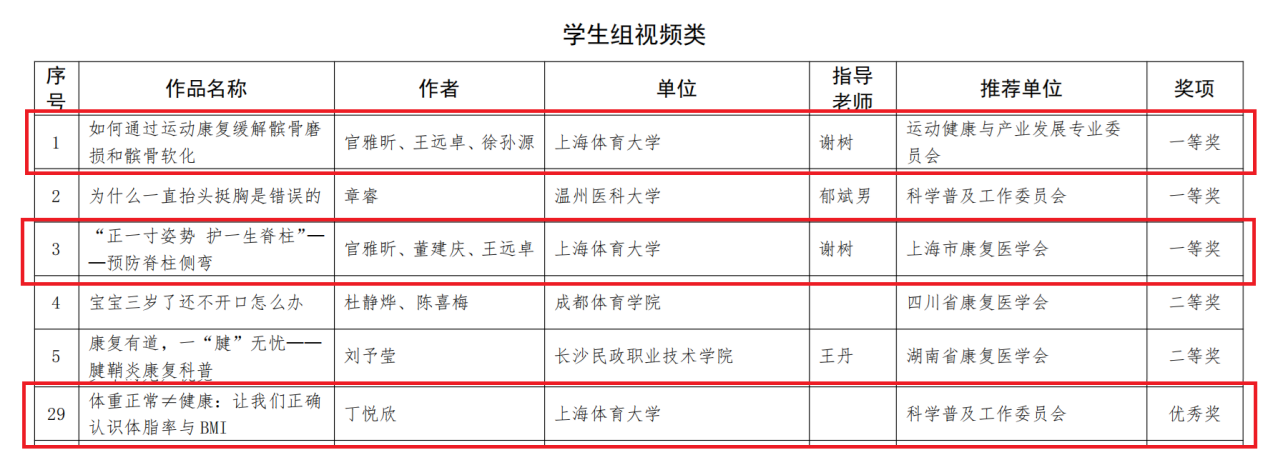 由今年会运动健康学院谢树老师指导、23级本科生官雅昕、董建庆和24级本科生王远卓、徐孙源等人创作的2个视频参赛作品《如何通过运动康复缓解髌骨磨损和髌骨软化》、《“正一寸姿势 护一生脊柱”——预防脊柱侧弯》均获得学生组视频类一等奖,运动健康学院22级本科生丁悦欣创作的视频作品《体重正常≠健康:让我们正确认识体脂率与BMI》获得学生组视频类优秀奖。