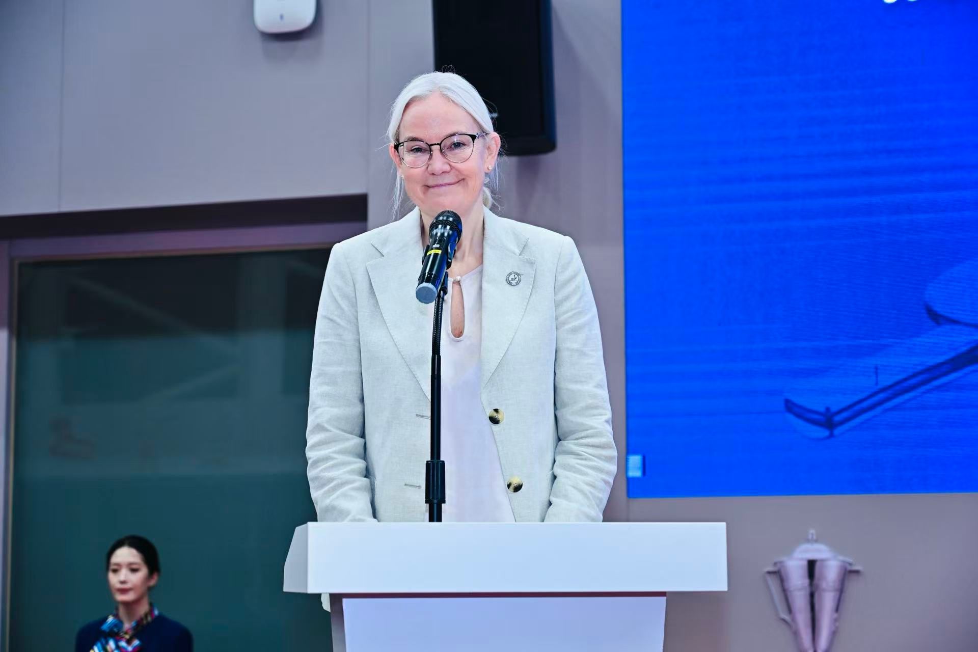 佩特拉·索林在仪式上发表致辞,她由衷感谢乒博馆为此次活动所做的精心安排,并表示:“2014年作为国际乒联副主席的我曾参与过乒博馆迁址上海的筹建工作。能够来到乒博馆,我感到非常高兴。巴黎奥运会火炬能够落户于此,与馆内众多珍贵的乒乓历史展品相伴,我深感荣幸。期待它能激励更多人热爱乒乓球运动,传承体育精神。”