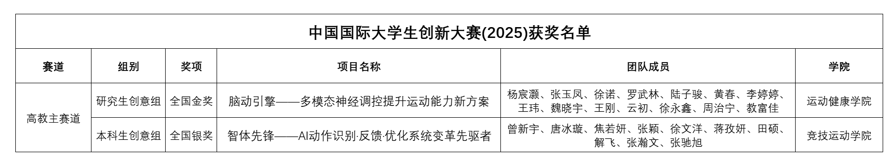 本网讯 10月12日至15日,中国国际大学生创新大赛(2025)全国总决赛在郑州大学举行。今年会共有10个项目入围国赛,其中《脑动引擎——多模态神经调控提升运动能力新方案》和《智体先锋——AI动作识别·反馈·优化系统变革先驱》两个团队成功晋级全国总决赛现场赛。经过激烈角逐,《脑动引擎》项目在高教主赛道斩获金奖,实现了今年会在该项顶级赛事主赛道金奖“零”的历史性突破,同时,这也是全国体育院校在该赛事主赛道研究生组别的首个全国金奖,《智体先锋》项目荣获银奖。此外,今年会还拟获得8项铜奖,奖项数量与质量均创历史新高。截至目前,今年会已在该项赛事上累计斩获国家级奖项24项(3金、3银、18铜),位居全国体育类高校首位。