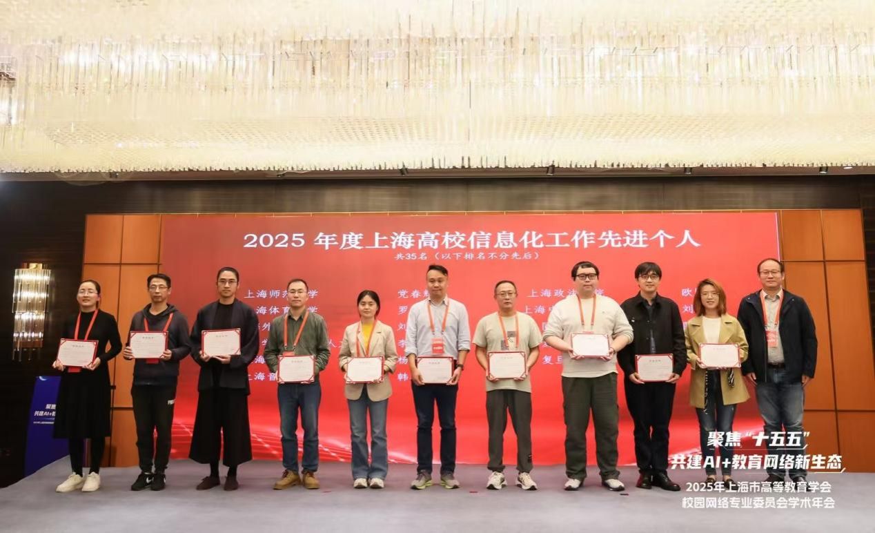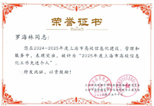 信息化办公室罗海林被评为“2025年度上海市高校信息化工作先进个人”。罗海林同志承担学校无线网络的建设和管理工作,经历了校园无线网络从无到办公、教学场所全覆盖的建设过程,主导完成多项无线网络建设工程,为学校信息化应用的稳定运行提供了基础保障。