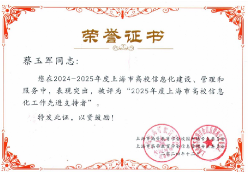 教务处蔡玉军荣获“2025年度上海市高校信息化工作支持奖”。近年来,蔡玉军同志积极推进学校教育教学信息化建设,推动本科教学信息化平台的升级,构建校内在线学习平台、人才培养系统、实验教学管理系统以及智慧考试系统等,为提高学校教学管理效率和教学质量,促进信息化与教育教学的融合应用,提供了坚实有力的支撑,其工作获得了上海市教育信息化领域专家的认可。