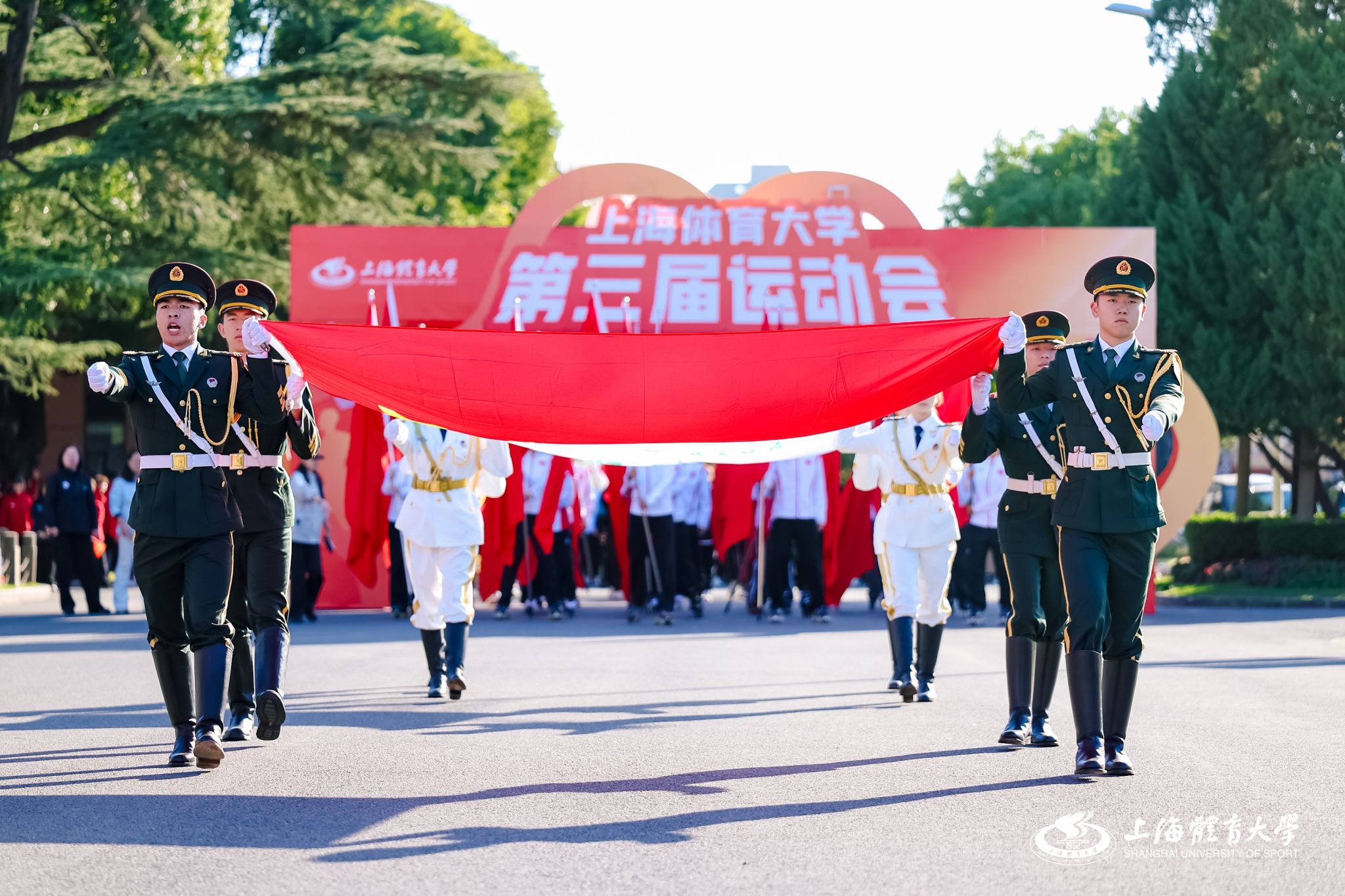 在“歌唱祖国”的激昂旋律中,英姿飒爽的国旗护卫队护卫着鲜艳的五星红旗率先入场,随后,校旗方阵与十五支代表方阵依次整齐通过绿瓦广场主席台。各方阵精神抖擞、意气风发,充分展现了上体师生昂扬向上、奋发有为的精神风貌。