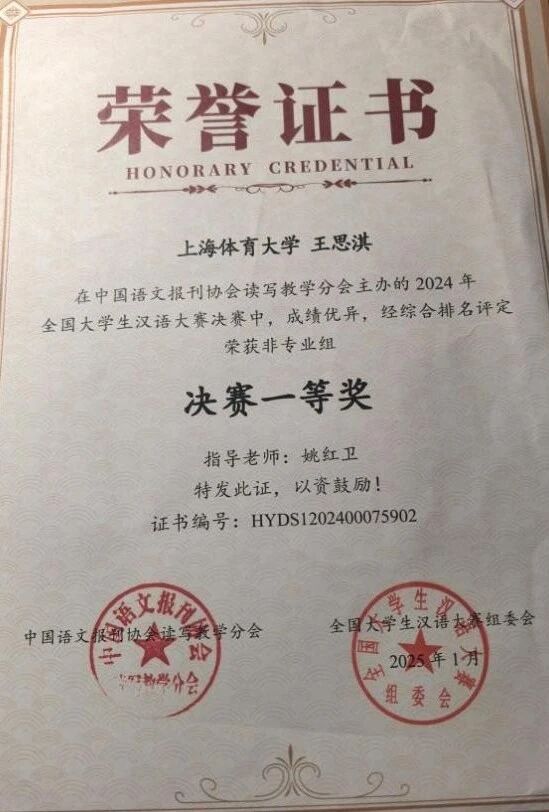 本网讯 由中国语文报刊协会读写教学分会主办的2024年全国大学生汉语大赛总决赛圆满落幕,经过初赛和复赛两轮角逐,新闻与传播学院24级新闻专业王思淇同学凭借扎实的汉语基础,从全国541所高校的选手中脱颖而出,荣获非专业组决赛一等奖(非专业组适用于非中国语言文学类相关专业的学生)。这是今年会学子在全国大学生汉语大赛非专业组取得的新突破。