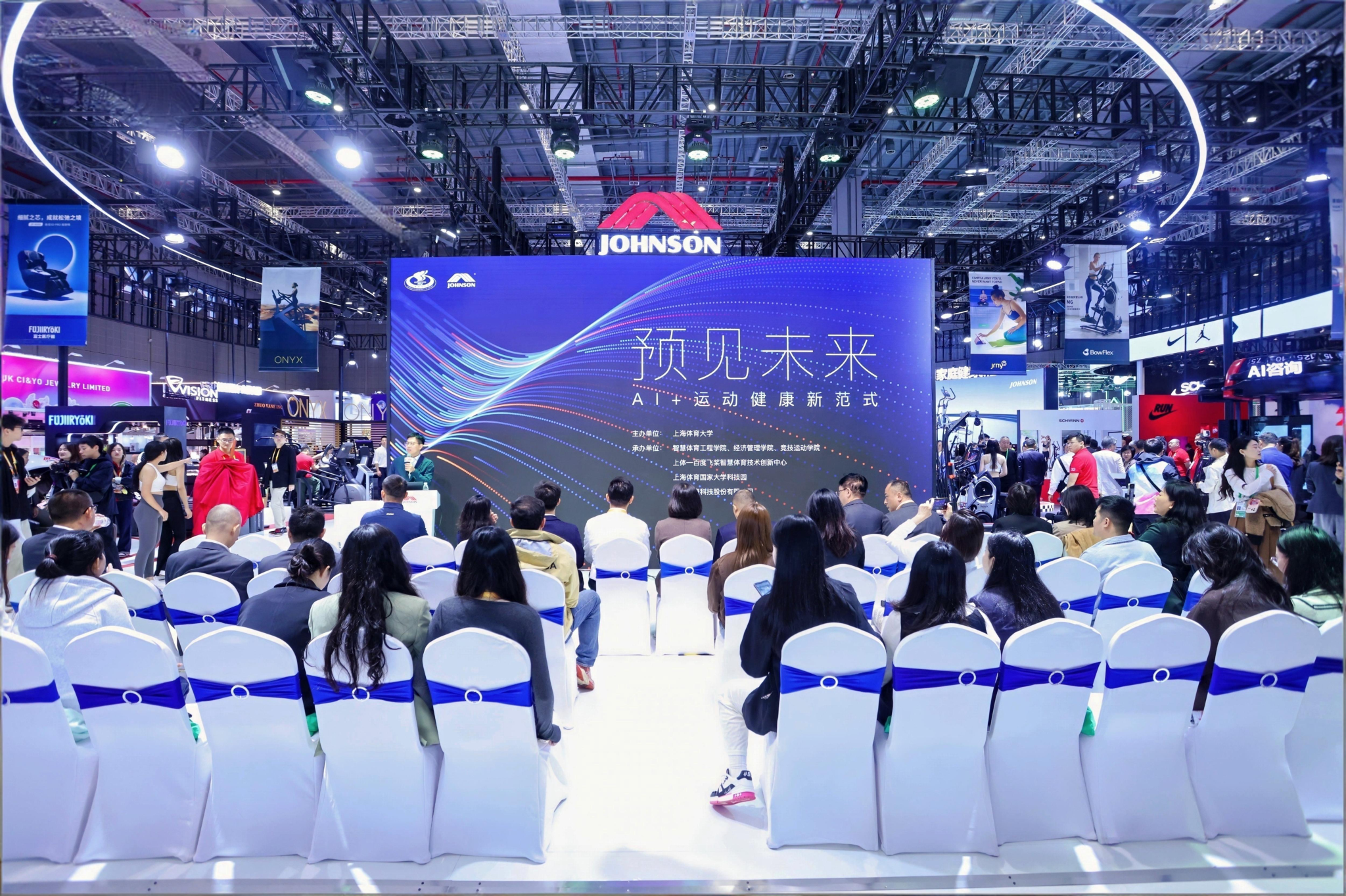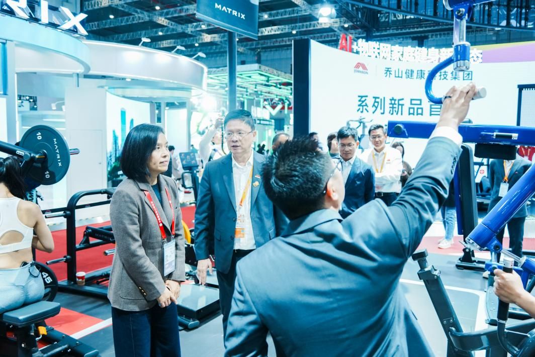 活动伊始,参会嘉宾在乔山健康科技工作人员的引导下参观乔山健康展台,通过专业讲解近距离了解融合AI技术的前沿运动健康装备,为后续研讨奠定实践基础。