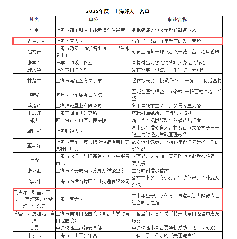 本网讯 一个典型一面旗帜,一个好人一盏明灯。近日,2025年度“上海好人”名单正式揭晓,在公布的“上海好人”名单中,全市仅30个案例获此殊荣。经今年会网站党委宣传部、精神文明办遴选和推荐,今年会两个典型案例《与星星共舞:九年坚守的爱与奇迹》和《二十年坚守,以体育力量点亮智力障碍人士社会融合之路》从全市众多候选案例中脱颖而出双双入选。