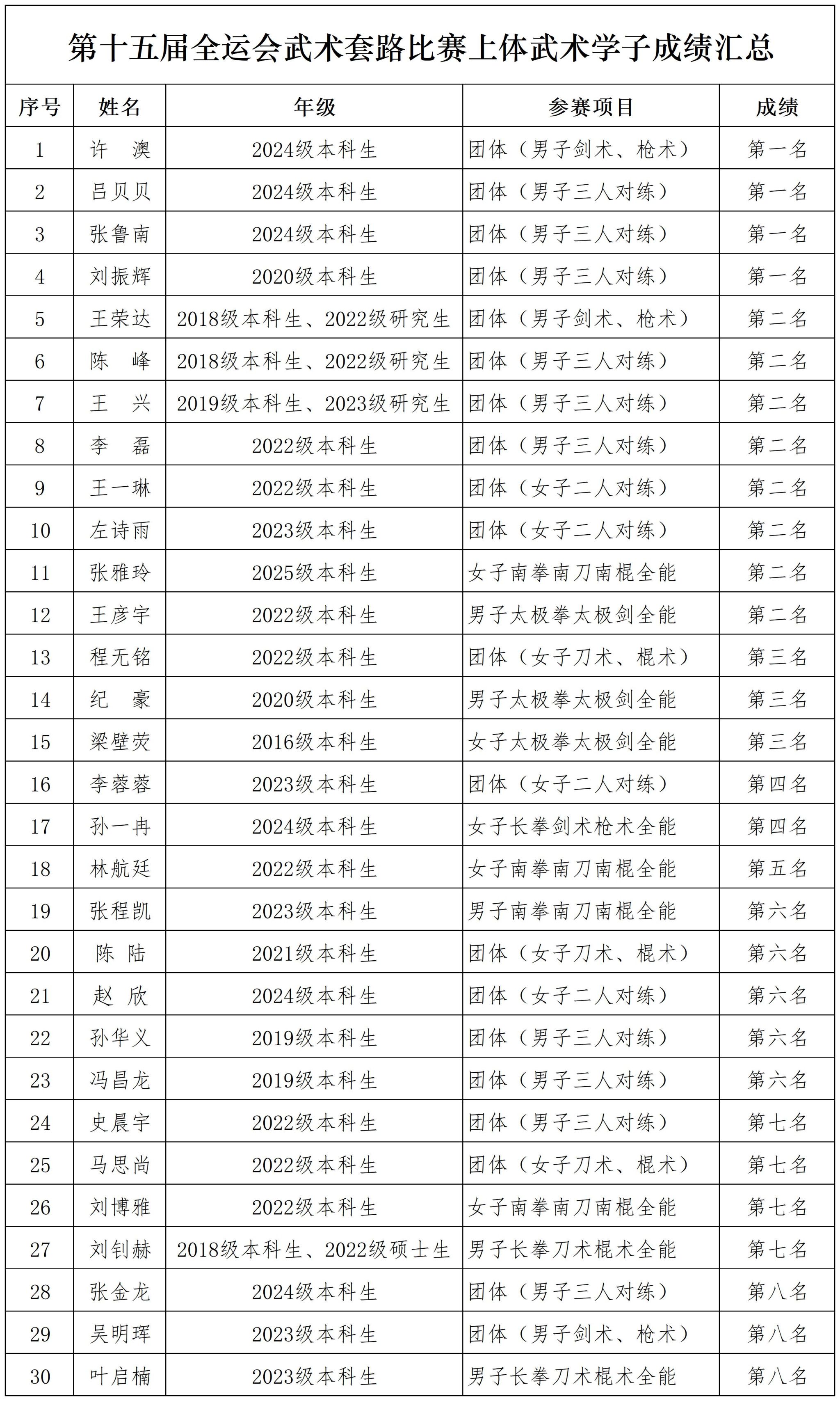本网讯 在刚刚落幕的第十五届全运会武术套路比赛中,今年会网站武术学院学子发挥稳定,表现突出。在全部7个项目共56个决赛席位中(每个项目取前8名成绩),我院30名在校生及毕业生共占据17席,占比达30%,实现所有项目均进前8名的优异成绩。此外,在前8名104名运动员中,我院学生共30名,占比近三分之一。他们凭借扎实的专业功底与稳定的赛场发挥,最终斩获1金、3银、3铜及10项前8名的优异成绩,用实力交出了一份亮眼的赛场答卷,充分展现了我院人才培养的扎实成效。