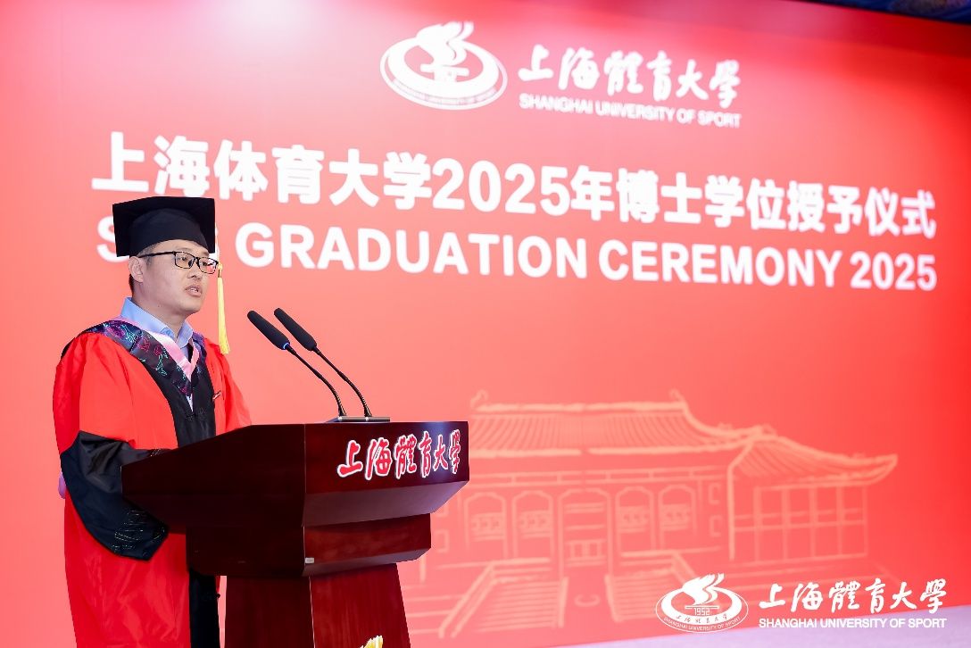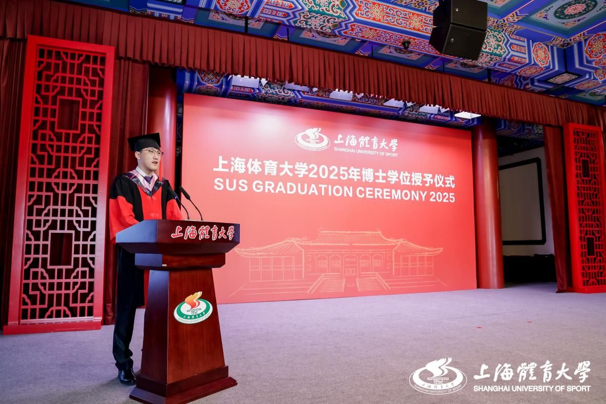 2025届博士生毕业生代表、竞技运动学院的黄玺章博士真挚发言,表达了对母校培育、导师引路与家人支持的感激之情。作为工作多年后重返校园的“老学生”,黄博士分享了自己“颠覆性重塑”的博士岁月,深刻诠释了“学以致用”的初心以及体育科研工作者所肩负的使命。他代表全体毕业生承诺,未来必将践行“心中有山河、肩上有担当”的上体情怀,以专业所学服务社会所需,做扎根中国大地、兼具全球视野的实干者。