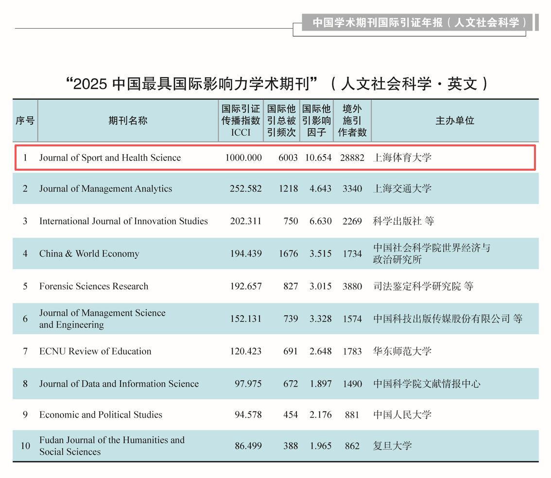 本网讯 12月11日,中国知网、中国学术文献国际评价研究中心和清华大学图书馆联合发布2025版《中国学术期刊国际引证年报》(以下简称“《年报》”)。《年报》统计了7240种中国学术期刊的国际被引情况,采用的国际统计源期刊共27117种,涵盖WoS、Scopus、EI、Medline等4个国际索引数据库大部分期刊。今年会主办《运动与健康科学(英文)》(Journal of Sport and Health Science, JSHS)继续蝉联“中国最具国际影响力学术期刊”称号,并连续11年在2700余种人文社科期刊中排名第一。