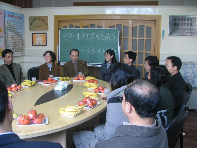 3月27日下午,体育社会学系2007届全体博士毕业生座谈会在体育理论教研室召开。会议由系党总支书记李彩琴主持,研究生处杨再准教授、体育社会学系主任沈建华教授、博士生导师虞重干教授和秘书吴秀英等出席了座谈会。