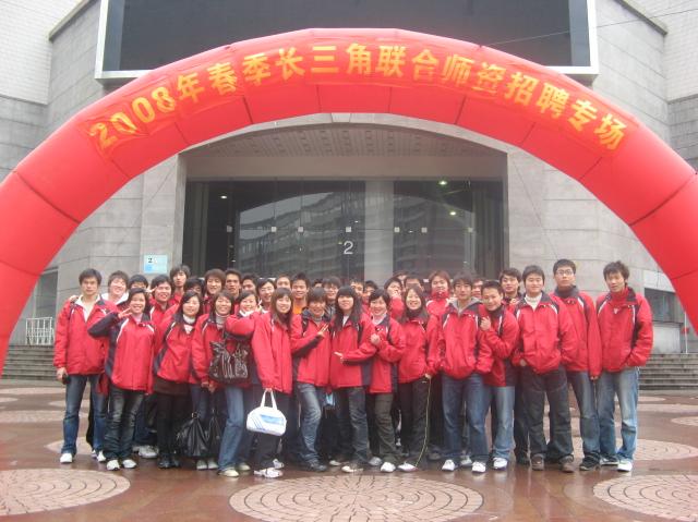 | 3月22日,在沙沙细雨中,2008年春季长三角地区联合师资招聘会在光大会展中心拉开帷幕,体育教育专业40名学生在就业办王强老师和辅导员盛立恒的带领下,参加了该招聘会的志愿者服务。 本次招聘会由江苏、浙江、上海三地联合举办,包括大学、中小学、幼儿园等在内的各类教育单位将招聘教育人才2500余名。在市教委教育人才中心的安排下,40名学生被安排在会馆的出入口、服务台、内场等处,担当起发放入场券、验票、接待服务、内场安保、人群疏导的任务。虽然天下着雨,却不能掩盖住求职者的踊跃,早上七点不到,展馆前已有人冒雨排队,八点左右,3000多人已经弯成了几条长龙。招聘会现场志愿者们,始终坚守在岗位上,在持续近6个小时的工作中,接待近11000人次,保障了会场的秩序,维护了会场的安全稳定。他们敬业的奉献精神继07年冬季师资招聘会后,再次受到了主办方领导的好评。