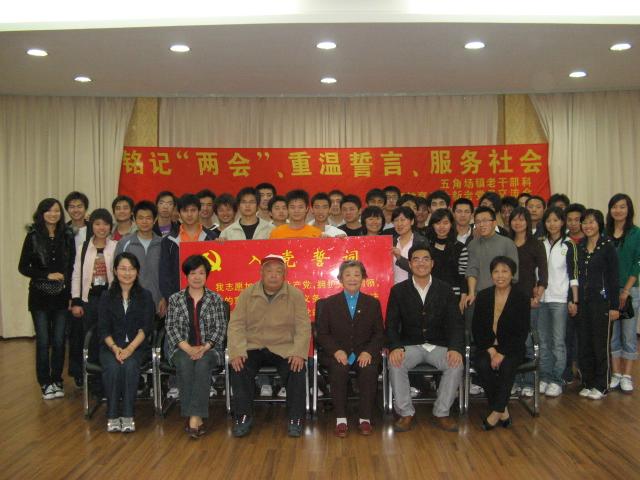 | 5月9日下午,体训学院体教专业05年级党支部与五角场镇老干部科开展了,以“铭记两会,重温誓言,服务社会”为主题的新老党员交流会。体训学院党总支副书记冉毅、杨浦区关工委办公室吴佳莹、五角场镇老干部科应爱珍、离休支部书记刘雪娟和老干部关心下一代成长团团长白玉堂出席了本次交流会。体教专业05年级共55名学生党员与入党积极分子参加了交流学习。会议由辅导员盛立恒主持。 2年多来,五角场镇老干部科及关心下一代成长团的党员同志们以艰苦奋斗的先进事迹以及淳淳教导时刻鼓舞着我支部的入党积极分子,在多次交流活动中,许多同学端正了入党动机,明确了奋斗目标,通过组织培养及自身的努力,加入到了党组织中,并用实际行动传承和发扬了老党员同志们的优良品质,尤其在特奥运动会、女足世界杯、奥运会志愿者服务以及上海市、学校等重大政治活动任务中,充分发挥了党员的先锋模范作用,出色完成任务,并使年级广大入党积极分子紧紧团结在党的周围,增强了党支部的凝聚力和战斗力。这些都与老党员同志们对我们长期的关心和培养是分不开的。