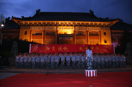 6月27日晚上六点, 上海体育学院2008级本科生军训团“肩负使命,爱我中华”歌咏比赛暨军民联欢会在绿瓦大楼前隆重举行。校园上空歌声飞扬,欢呼掌声不断。军训工作指导小组组长、院党委副书记、副院长戴健,军训团政委黄顺章,军训团参谋长贾爱民,院长助理、院长办公室主任陈晓峰、院学工部部长游林生、院宣传部副部长赵晓晗、院团委书记、财务处副处长刘勇等,与08级军训团的广大教官、教导员、指导员及所有参训连队共同参与了本次晚会。这夜,星光灿烂;这夜,绿瓦大楼前上演着一场热情精彩的演出,见证着温馨真挚的军民鱼水情,诉说着青年人报效祖国的豪情与信念。