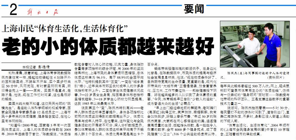 本网讯10月7日,在我院即将迎来60周年校庆之际,《解放日报》要闻版(第2版)头条发表题为《上海市民“体育生活化,生活体育化”——老的小的体质都越来越好》的配图文章。文章中,我院副院长陈佩杰教授讲述了上海市民十多年来的体质健康、健身理念变迁情况。