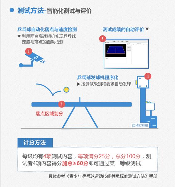 “乒乓球标准”采用“三等九级制”的整体设计。第一等为“入门级”,对应“乒乓球标准”中的1-3级;第二等为“普及级”,对应“乒乓球标准”中的4-6级;第三等为“提高级”,对应“乒乓球标准”中的7-9级。此外,标准还预留了第四等——专业级,以便未来与竞技体育对接。此次“乒乓球标准”摒弃传统乒乓球考核方法,将全部采用质量稳定、具有数码编程的乒乓球发球机作为陪测;摒弃技评,引用摄像头自动感应进行判分,选用黄白双色球实施等级考核,从而保证了标准测试的客观性。