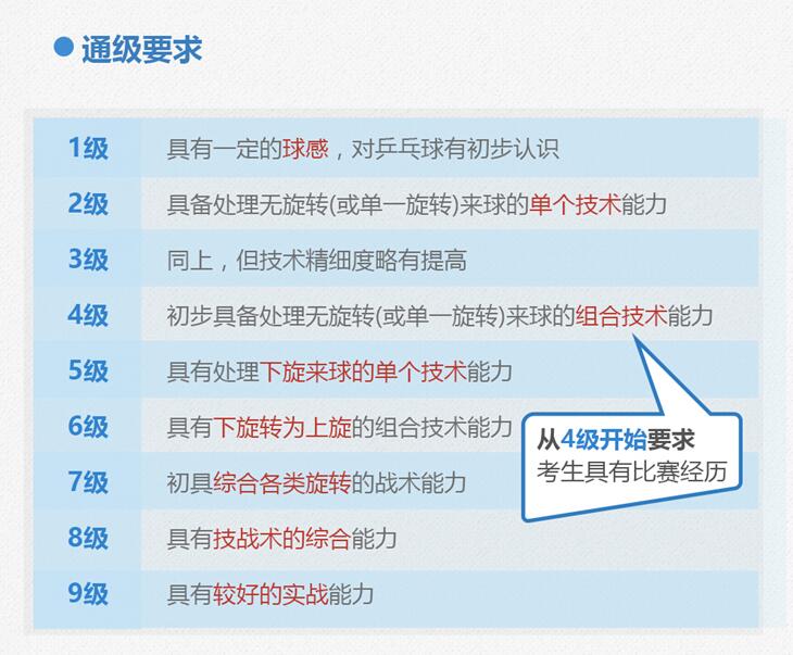 “乒乓球标准”每级均有4项测试内容,每项满分25分,总分100分,测试者4项内容得分加总≥60分即可通过某一等级测试。随着等级的升高,对青少年运动技能的要求逐渐提高,比如:一级要求“对空颠球”“对墙颠球”“托球绕桌跑”“双手接球”即可,二级则要求“平击发球“”反手推/拨上旋球“”正手攻球上旋球“”1/2台正手两点攻”。
