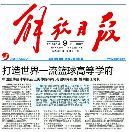 本网讯8月8日,“中国篮球协会篮球学院”在我院揭牌成立,国家体育总局副局长李颖川和上海市副市长翁铁慧为“中国篮球协会篮球学院”揭牌。国家篮协主席姚明和上海体育学院党委副书记、院长陈佩杰共同签署《中国篮球协会、上海体育学院“中国篮球协会篮球学院”合作协议》。国家篮协主席姚明当选篮球学院院长,学院将集聚我国篮球运动和体育高等教育优质资源,立足上海、服务全国、面向世界,合作打造国内一流、国际知名的特色学院“中国篮球协会篮球学院”。学院一经成立,吸引了全国权威媒体的全面报道,各家媒体对于中国篮协篮球学院的成立给予了高度评价,对其未来的发展也给予了充分关注。