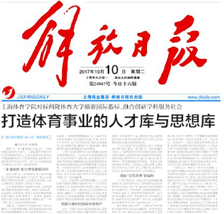 10月10日,《解放日报》发表专题文章《上海体育学院对标科隆体育大学瞄准国际指标,融合创新学科服务社会 打造体育事业的人才库与思想库》文章以大篇幅内容的报道,详实地介绍了学校这些年来的建设成果,未来的建设目标等内容。