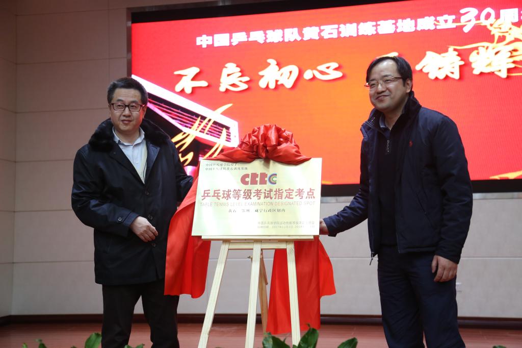 本网讯 26日上午,黄石国家乒乓球训练基地隆重举行中国乒乓球队黄石训练基地成立三十周年座谈会暨“中国乒乓球学院运动技能等级测试指定考点”揭牌仪式。黄石国乒基地正式被中国乒乓球学院授予黄石、鄂州、咸宁行政区划内的全国乒乓球等级考试考点。国际乒联副主席、中国乒乓球学院院长施之皓和湖北省体育局乒羽中心主任卢骏共同为考点揭牌。