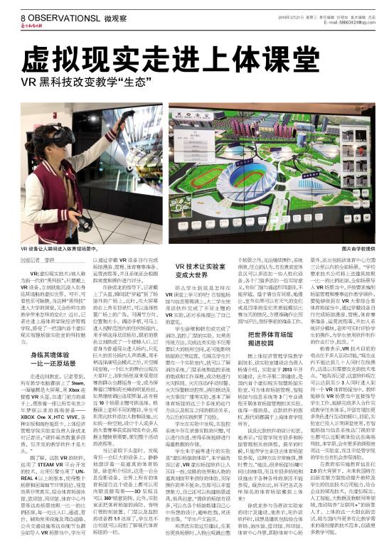 VR(虚拟现实技术)被人称为新一代的“黑科技”:只要戴上VR设备,立刻就能沉浸入如身临其境般的虚拟世界,可听、可看、甚至可触摸。当这种“黑科技”进入大学的课堂,又会给师生的教学带来怎样的变化?近日,记者走进上海体育学院经济管理学院,感受了一把国内首个虚拟现实智慧场馆实验室的科技魅力。