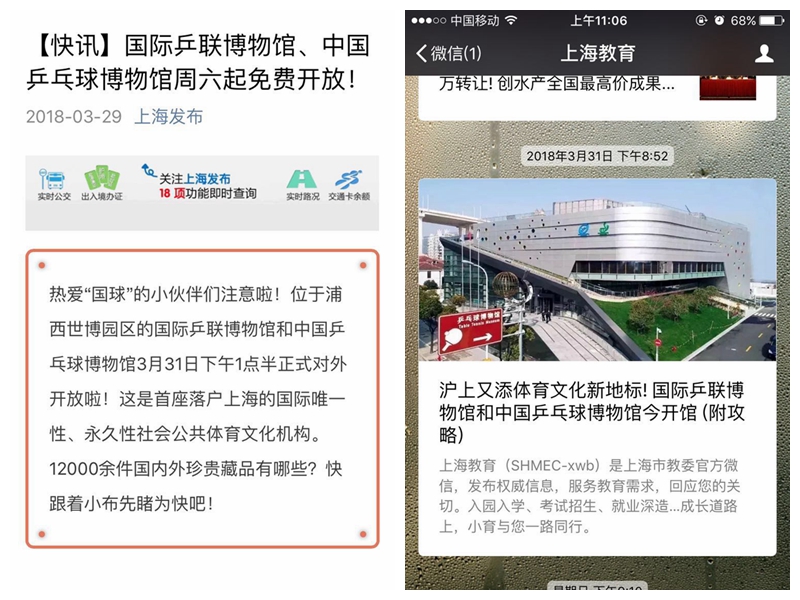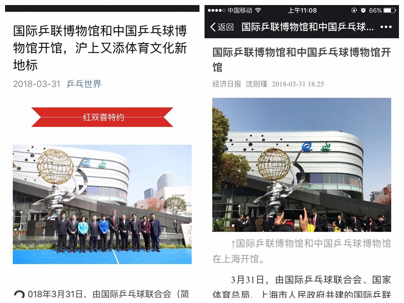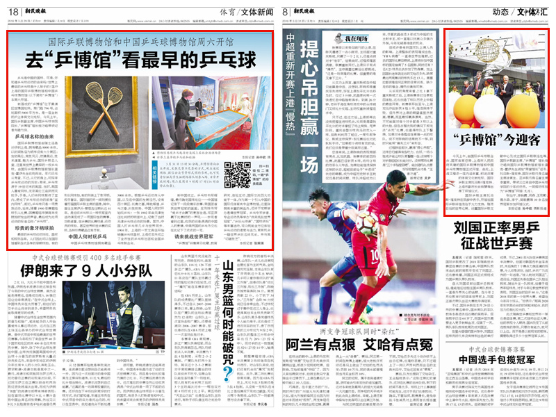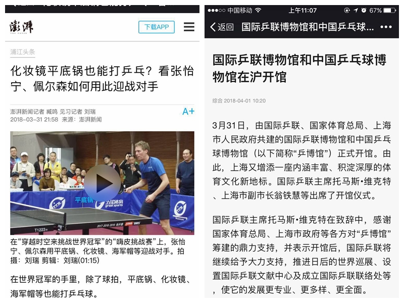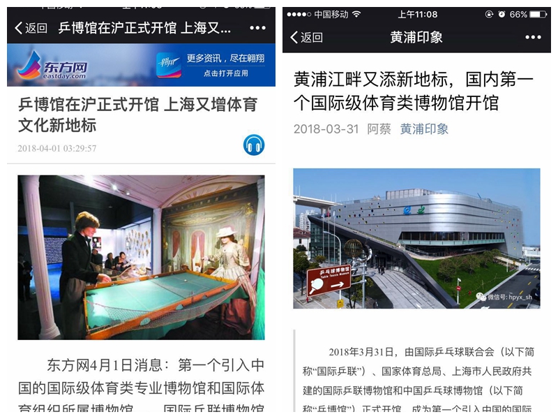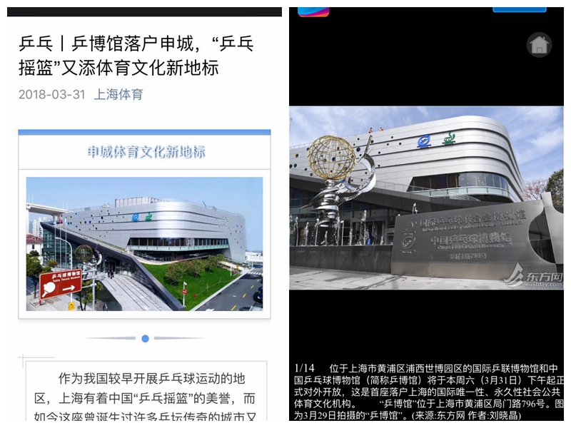 文汇报   乒乓迷看过来!黄浦江畔又添一体育文化新地标:国际乒联博物馆和中国乒乓球博物馆本周六开馆 http://wenhui.whb.cn/zhuzhanapp/xue/20180329/193675.html?timestamp=1522317679494&from=timeline&isappinstalled=0