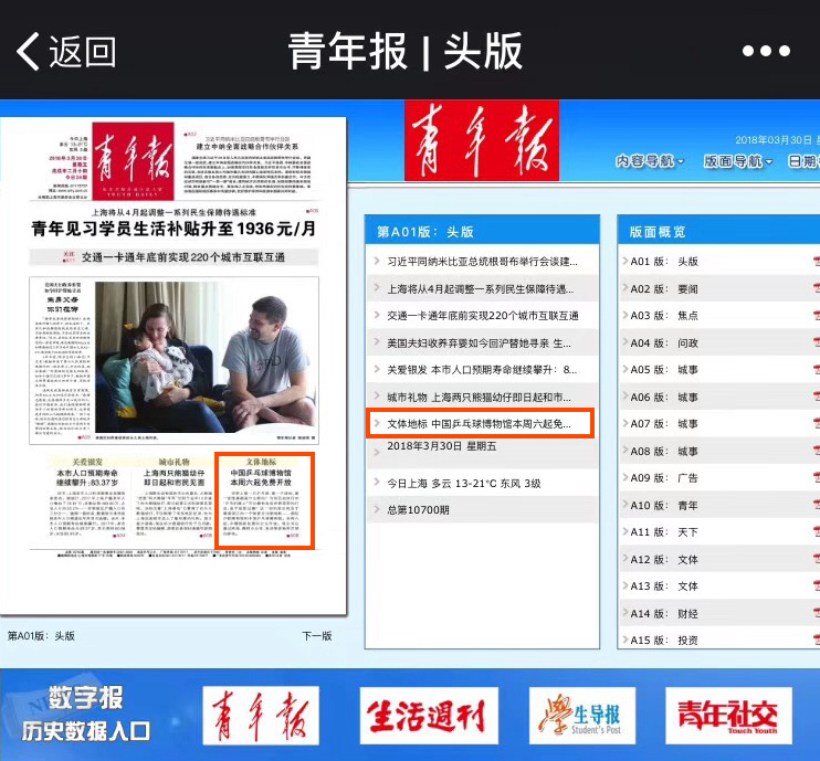 从3月28日新闻通气会和媒体探营活动召开后,解放日报、文汇报、中国体育报、青年报、新民晚报、新闻晨报等多家纸质媒体都在报眼、头版等重要位置刊登了乒博馆开馆的消息。解放日报于3月30日头版刊载了《又一上海文化品牌——乒博馆明日开馆》的新闻报道,4月1日,又在视觉版面整版刊载《乒乓之旅 穿越时空》的报道,解放日报新媒体上观还采用了直播的方式对乒博馆的情况进行了介绍。