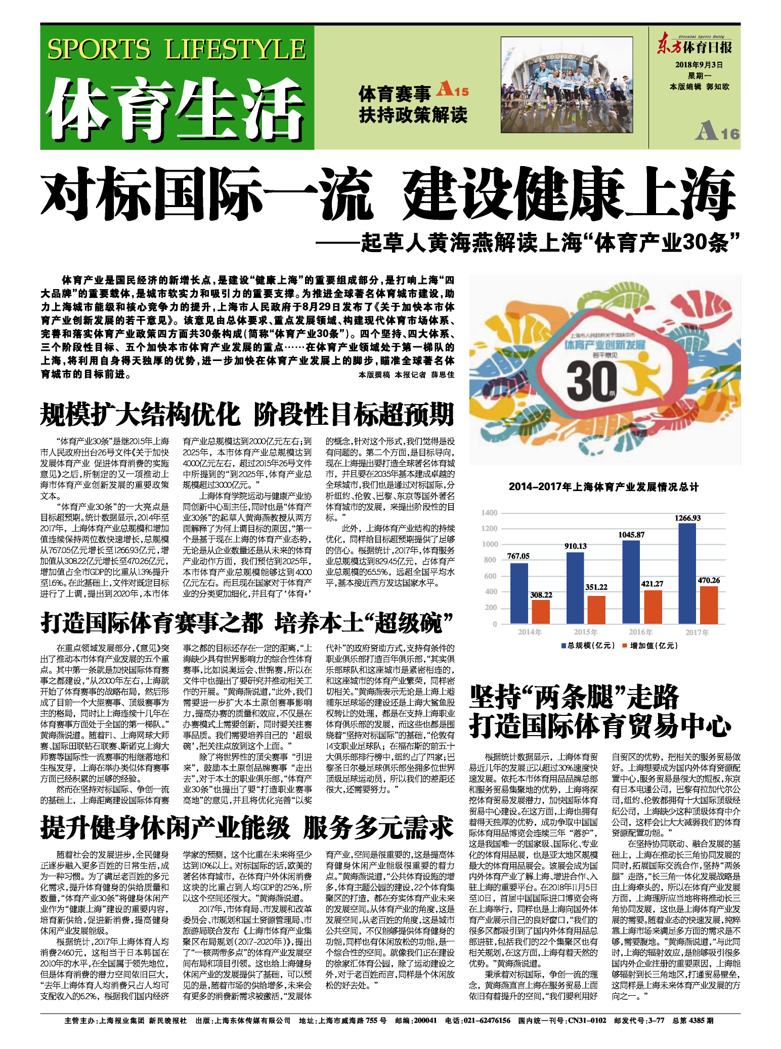 体育产业是国民经济的新增长点,是建设“健康上海”的重要组成部分,是打响上海“四大品牌”的重要载体,是城市软实力和吸引力的重要支撑。为推进全球著名体育城市建设,助力上海城市能级和核心竞争力的提升,上海市人民政府于8月29日发布了《关于加快本市体育产业创新发展的若干意见》。该意见由总体要求、重点发展领域、构建现代体育市场体系、完善和落实体育产业政策四方面共30条构成(简称“体育产业30条”)。四个坚持、四大体系、三个阶段性目标、五个加快本市体育产业发展的重点……在体育产业领域处于第一梯队的上海,将利用自身得天独厚的优势,进一步加快在体育产业发展上的脚步,瞄准全球著名体育城市的目标前进。本版撰稿 本报记者 薛思佳