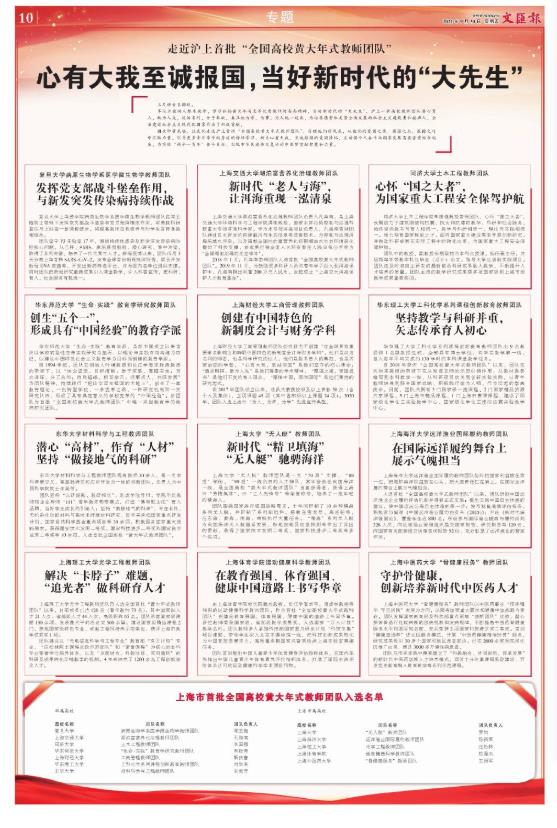 牢记立德树人根本使命,学习弘扬黄大年同志等优秀教师的高尚精神,当好新时代的“大先生”,沪上一批高校教师团队潜心育人,敢为人先,淡泊名利,甘于奉献,真正把为学、为事、为人统一起来,为培养德智体美劳全面发展的社会主义建设者和接班人、全面建设社会主义现代化国家作出了积极贡献。