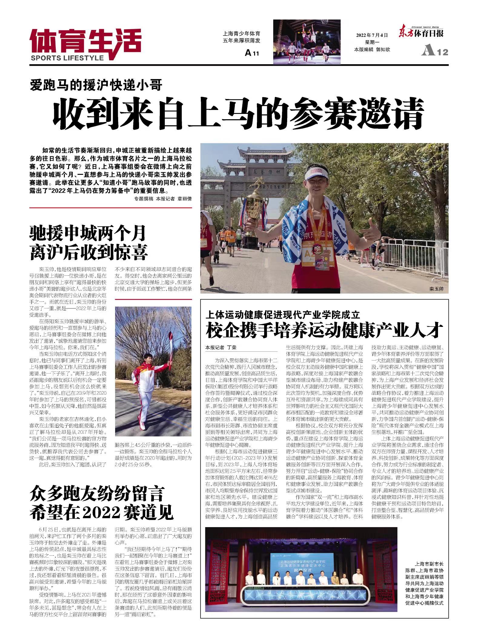 为深入贯彻落实上海市第十二次党代会精神,践行人民城市理念,推动高质量发展,创造高品质生活,日前,上海体育学院和中国太平洋保险(集团)股份有限公司举行战略合作签约暨揭牌仪式,通过校企深度合作,创新产教融合协同育人体系、新型公共健康人才培养体系和社会服务体系,更好满足市民群众对健康生活、幸福生活的向往。上海市副市长陈群、市政协副主席虞丽娟等相关领导出席,共同为上海运动健康促进产业学院和上海青少年健康促进中心揭牌。