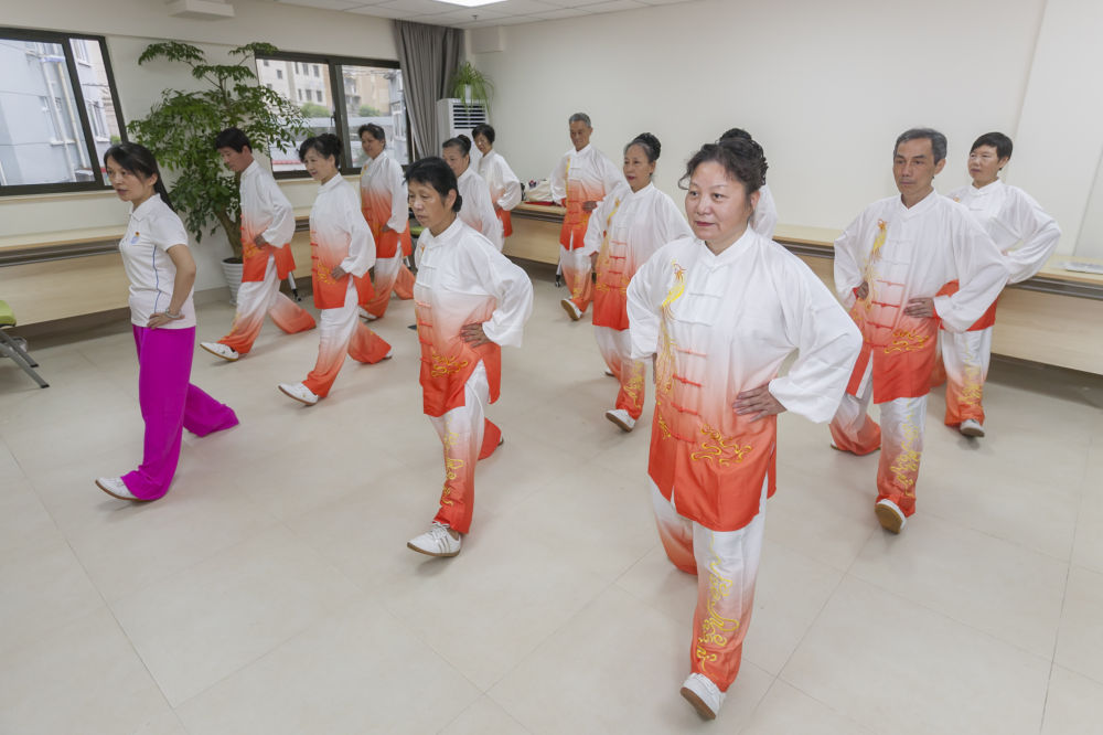 上海体育学院武术学院教授刘静作为社区健康师正在教授老人太极拳。