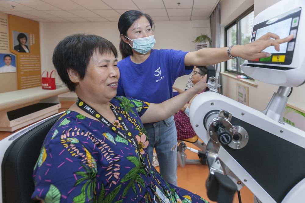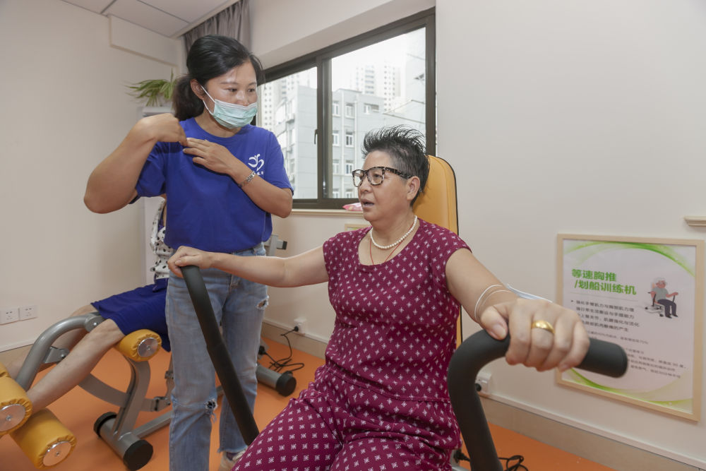 社区健康师张莉指导老人使用康复设备。