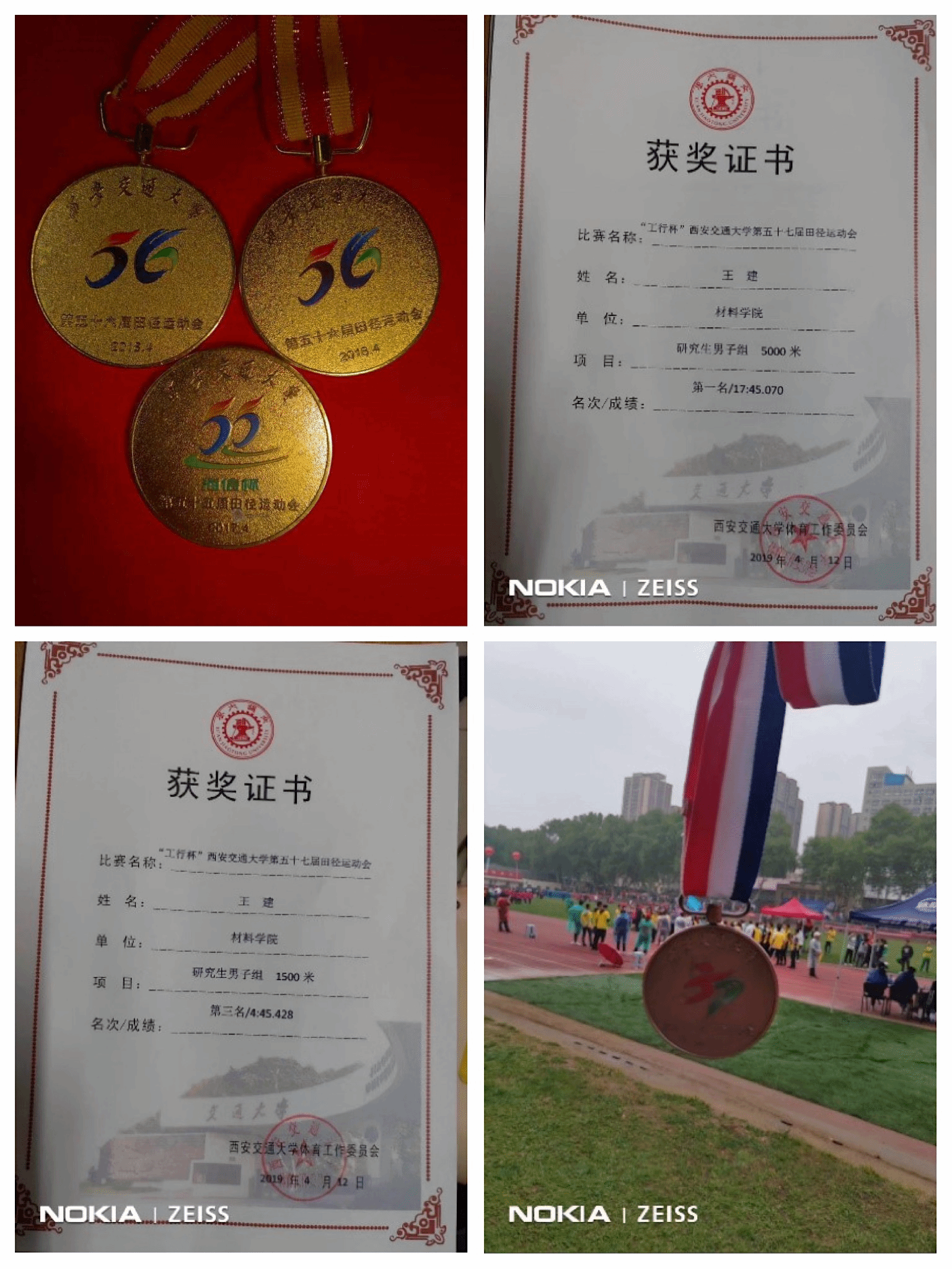 来自云南的一个小山村,本科有幸来到古都西安,来到交大。在这里留下太多美好的瞬间,但那时的自己基本和运动绝缘。回学校读研后,在钱军民老师的悉心指导下从事生物医用材料的制备研究工作,接触到很多跟疾病相关的信息,对健康有了更深的体会。积极锻炼,从一个运动小白不断成长。2017年以黑马姿态拿到校运会5000m比赛的第一名(也是人生关于体育的第一个第一)后,快速成长。积极参加学校的各种长跑比赛,并取得一定成绩。受邀组队代表学校参加过三次中国高校百英里接力比赛,并在上海站获得普通高校组第四名,为学校获得一张宝贵的总决赛入场券。今年的校运会上拿到5000m和1500m的双冠,特别是大雨中的5000m为学院赢得了荣誉,收获了掌声,也感动了自己。
